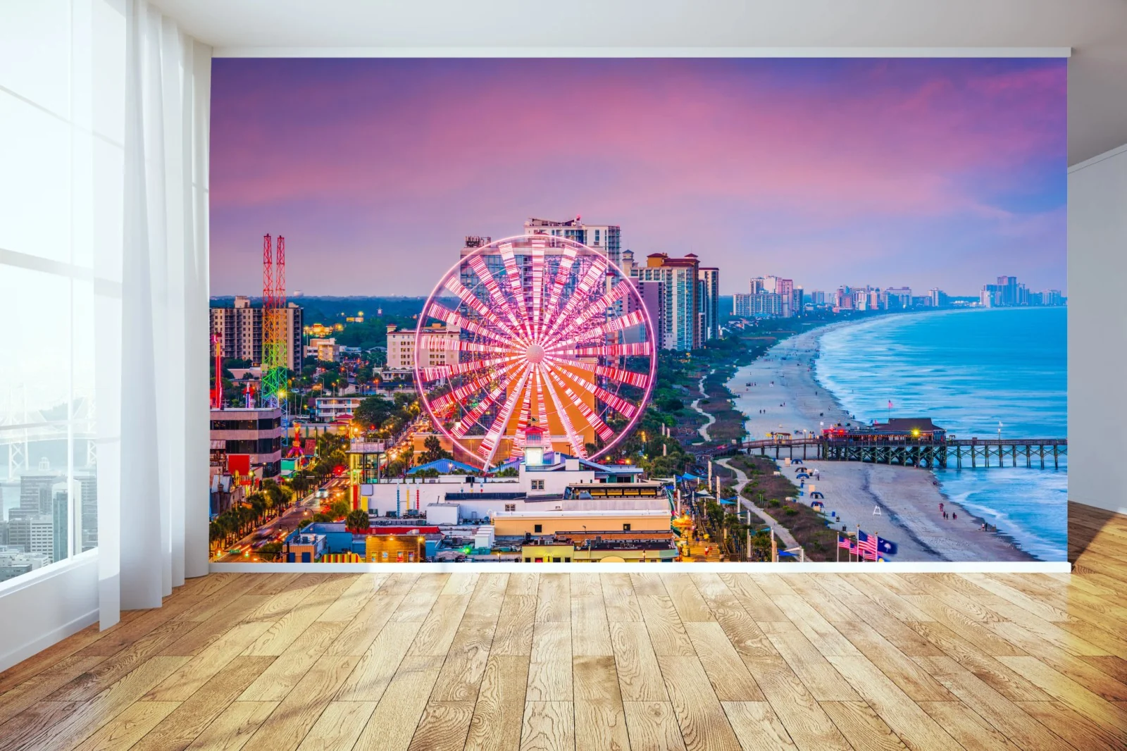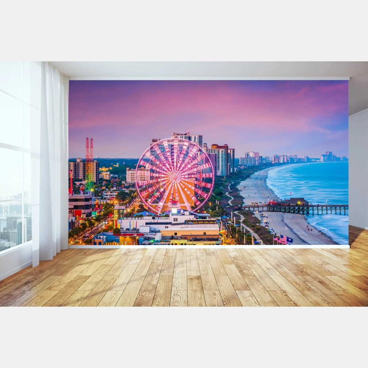 Fototapete Myrtle Beach sonnenuntergang über dem strand mit riesenrad