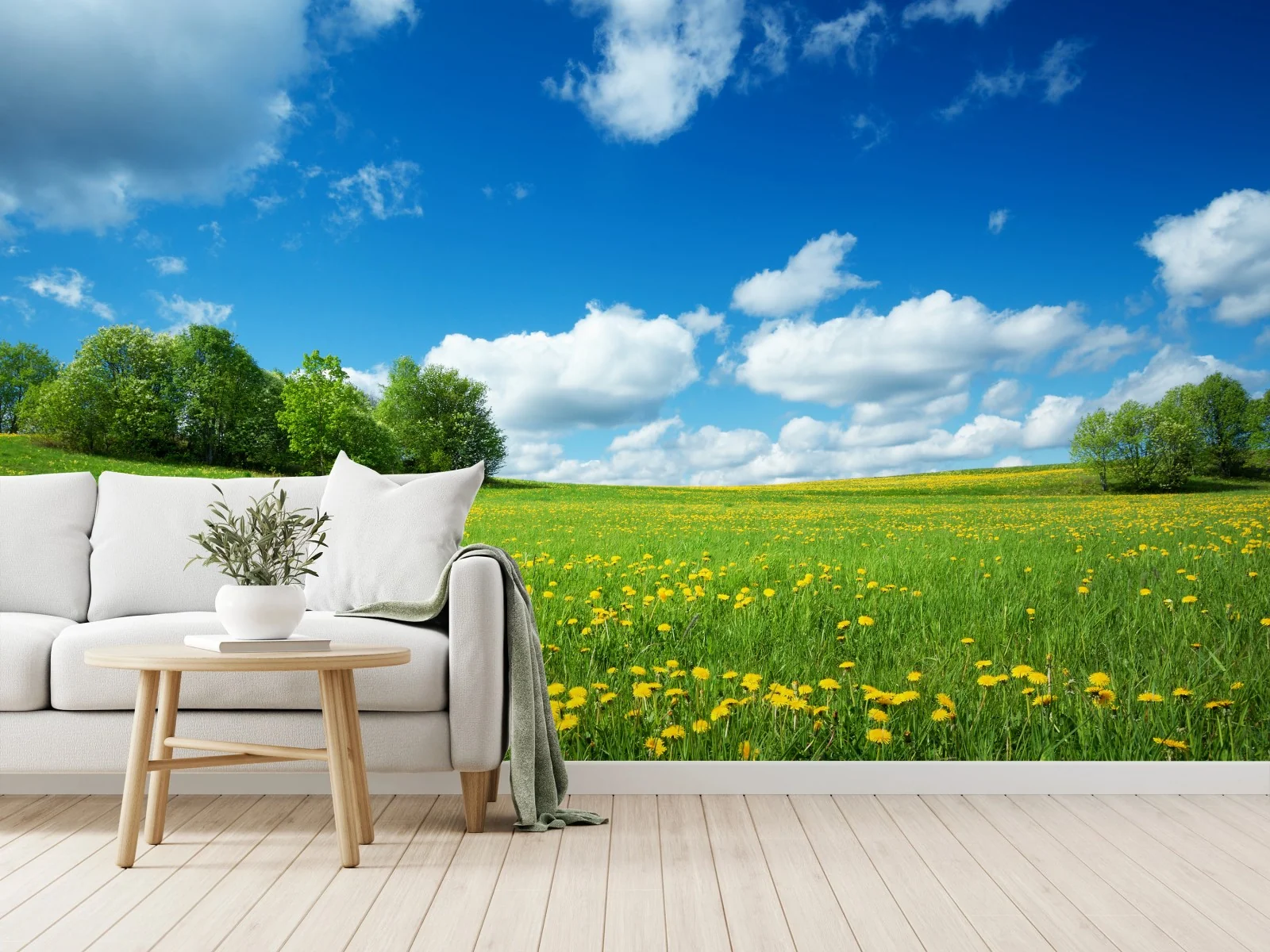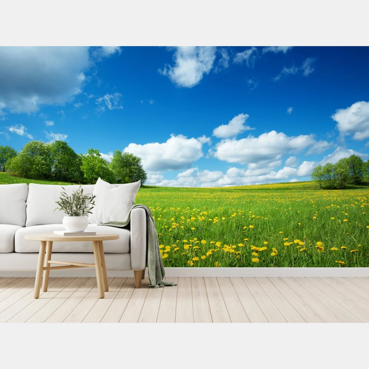 Fototapete Sonnige wiese mit löwenzahn und blauem himmel