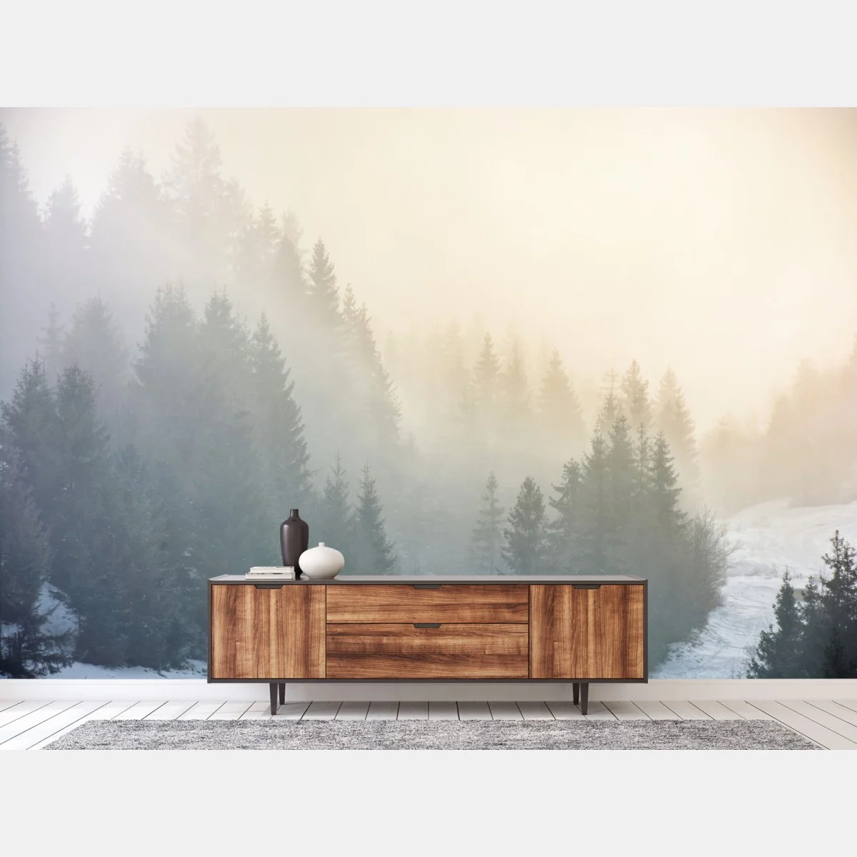 Fototapete Nebliger fichtenwald bei sonnenaufgang