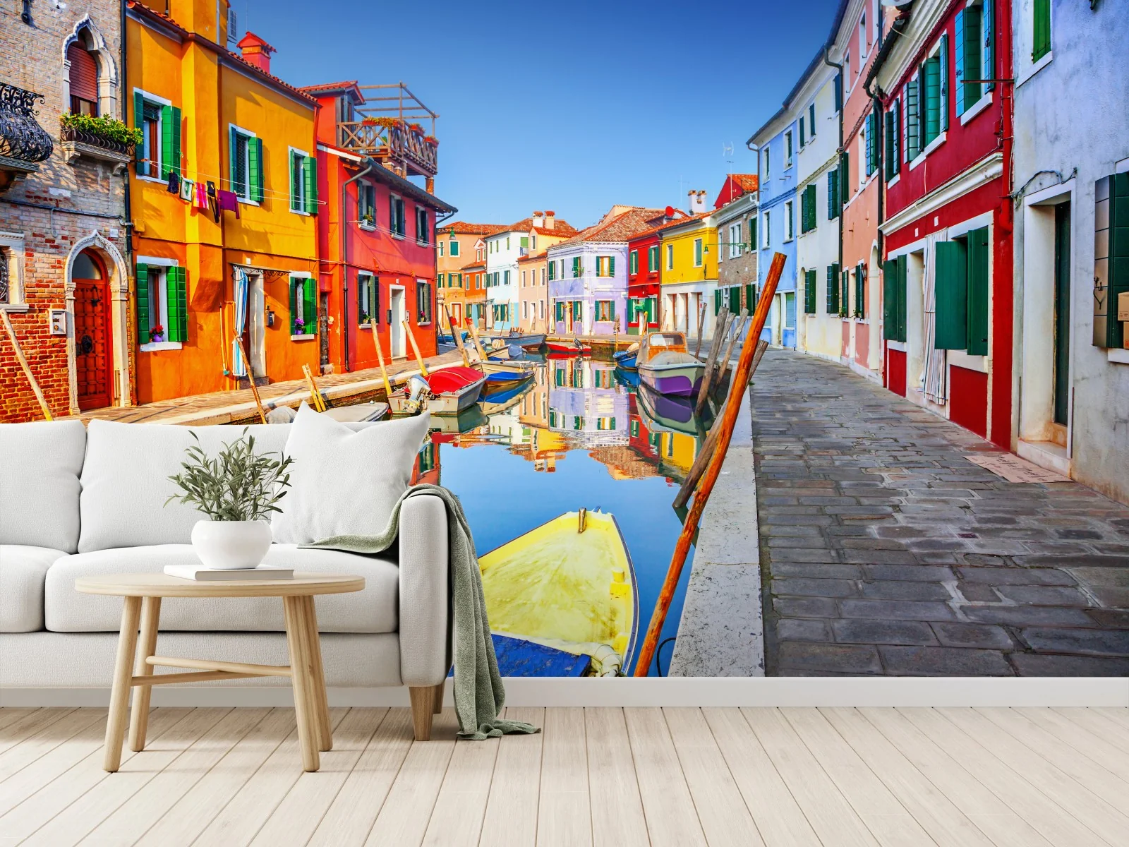 - spiegelung, kanal, architektur, reise, stadtansicht, farbenfroh, italien, boote, bunte häuser, burano