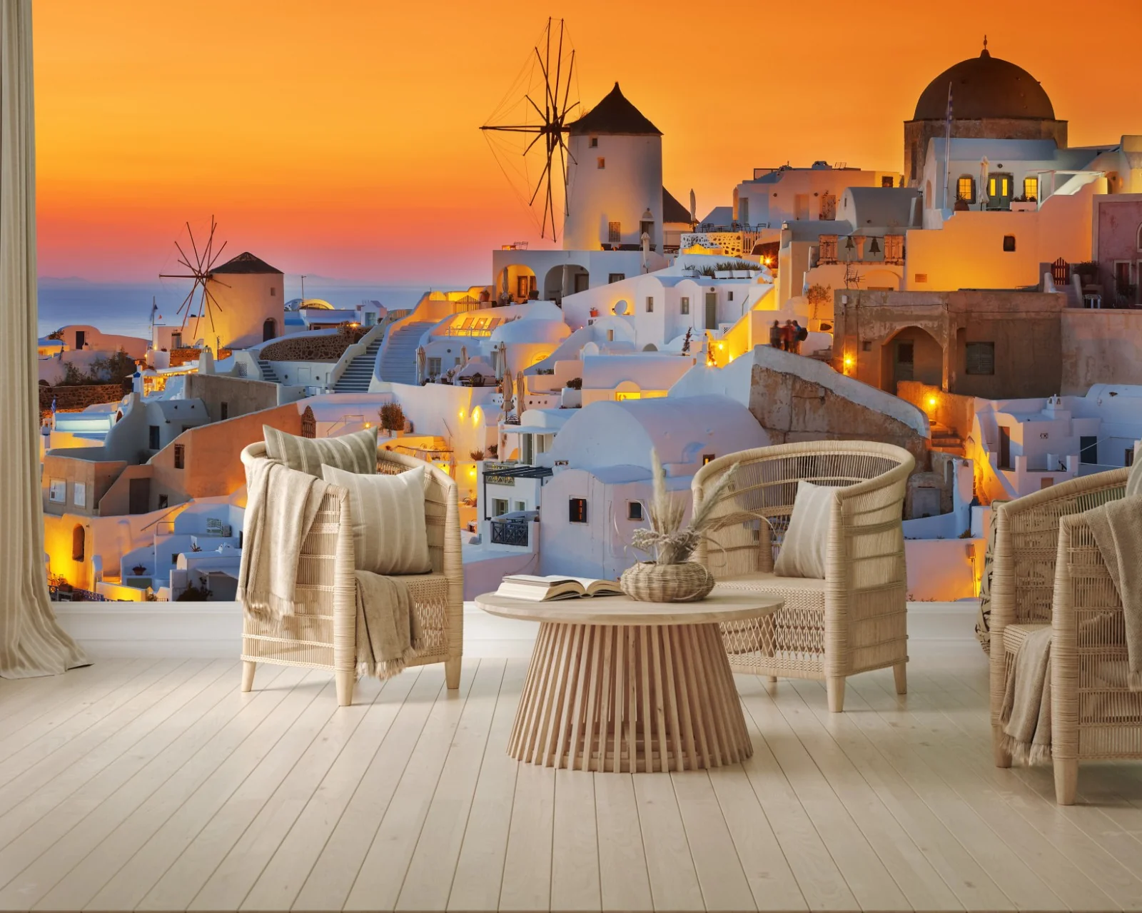 Ein warmer, goldener Sonnenuntergang taucht die ikonischen weißen Häuser und Windmühlen von Oia auf Santorini in ein ruhiges, mediterranes Licht und schafft eine perfekte Stimmung für jedes Wohnzimmer.MehrWeniger