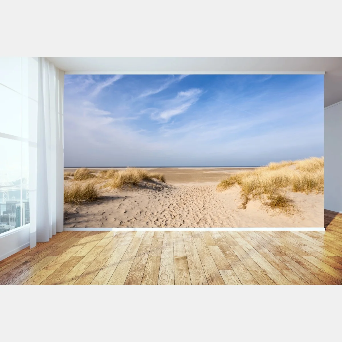 Eine ruhige Küstenszene mit Sanddünen und weitem Himmel, die Ruhe und Weite an Ihre Wände bringt.MehrWeniger