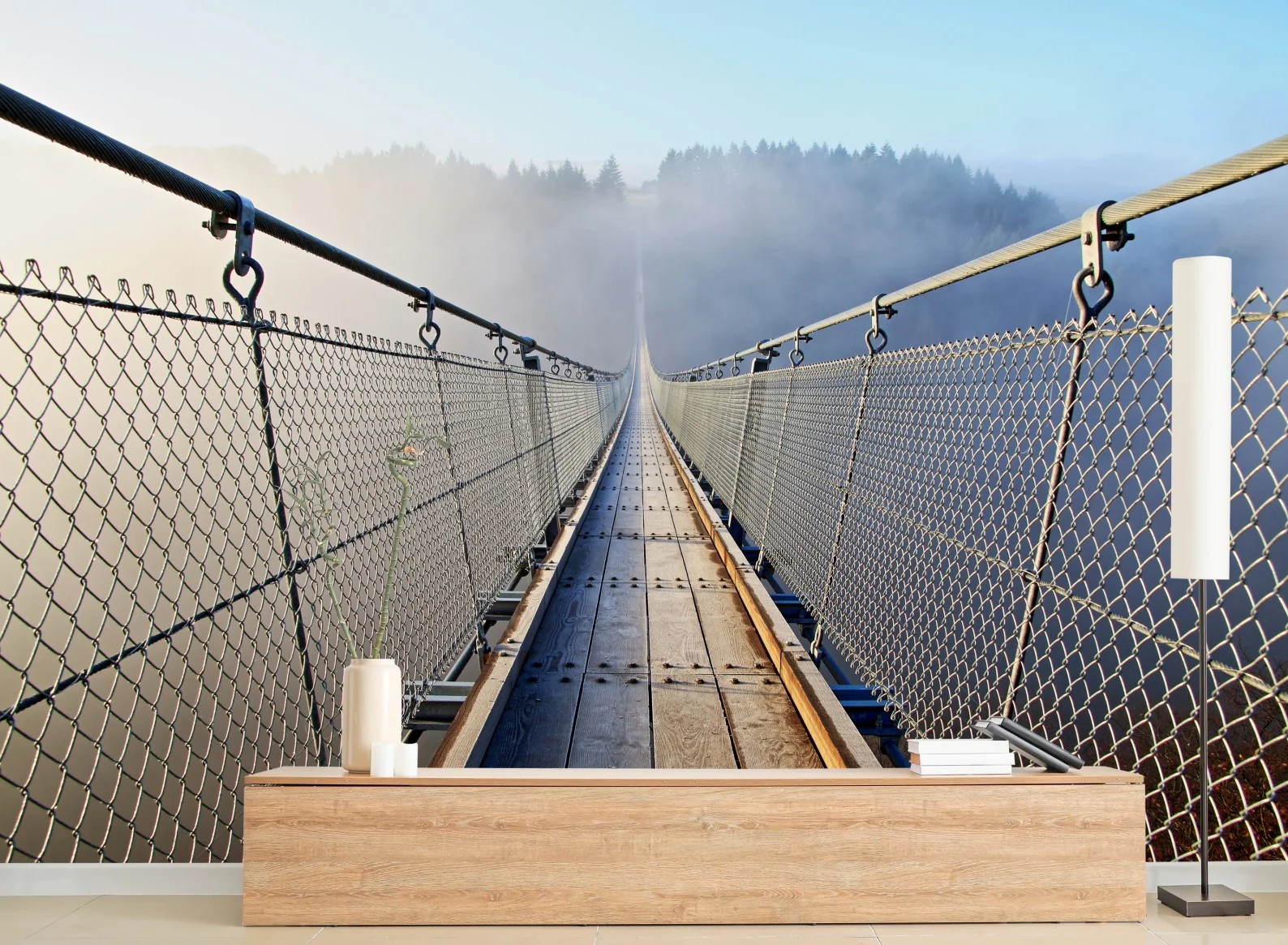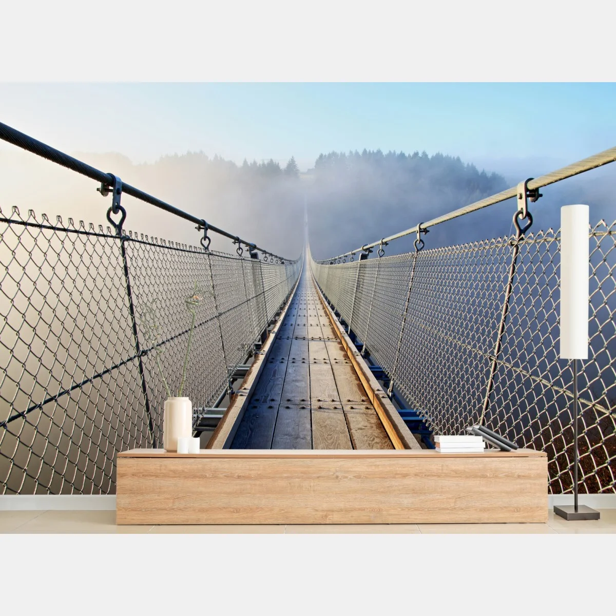 Fototapete Neblige hängebrücke, die in den wald führt