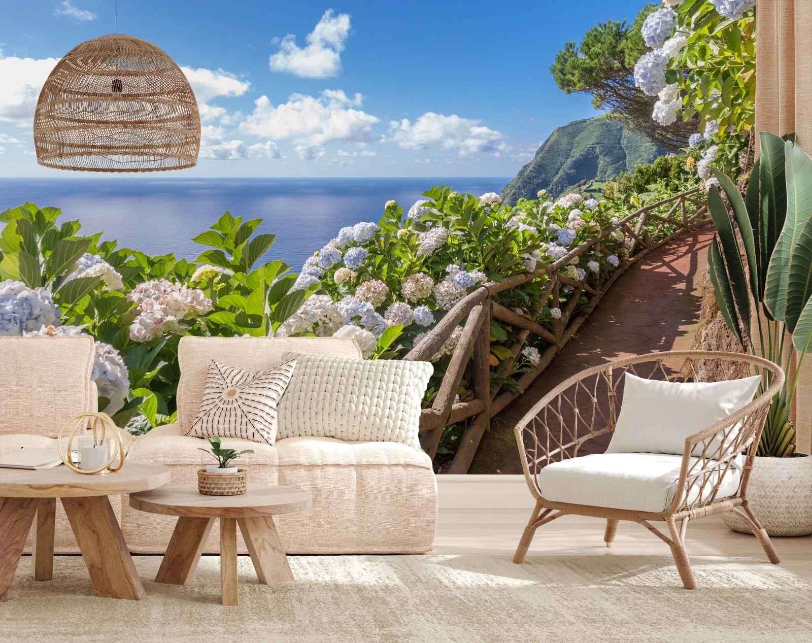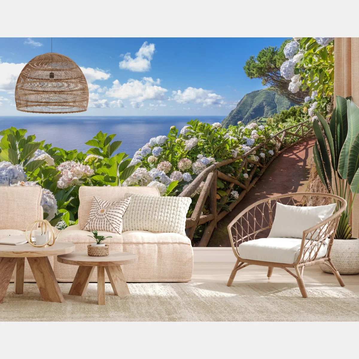 Fototapete Küstenweg mit hortensien, São Miguel, Azoren