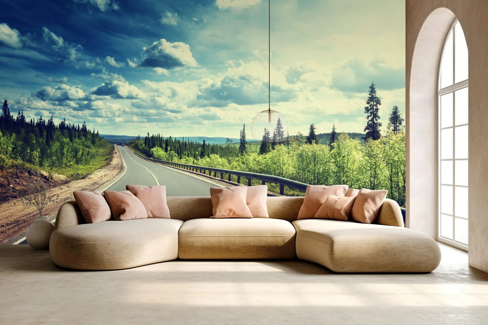 Fototapete Sonnenbeschienene waldstraße bis zum horizont