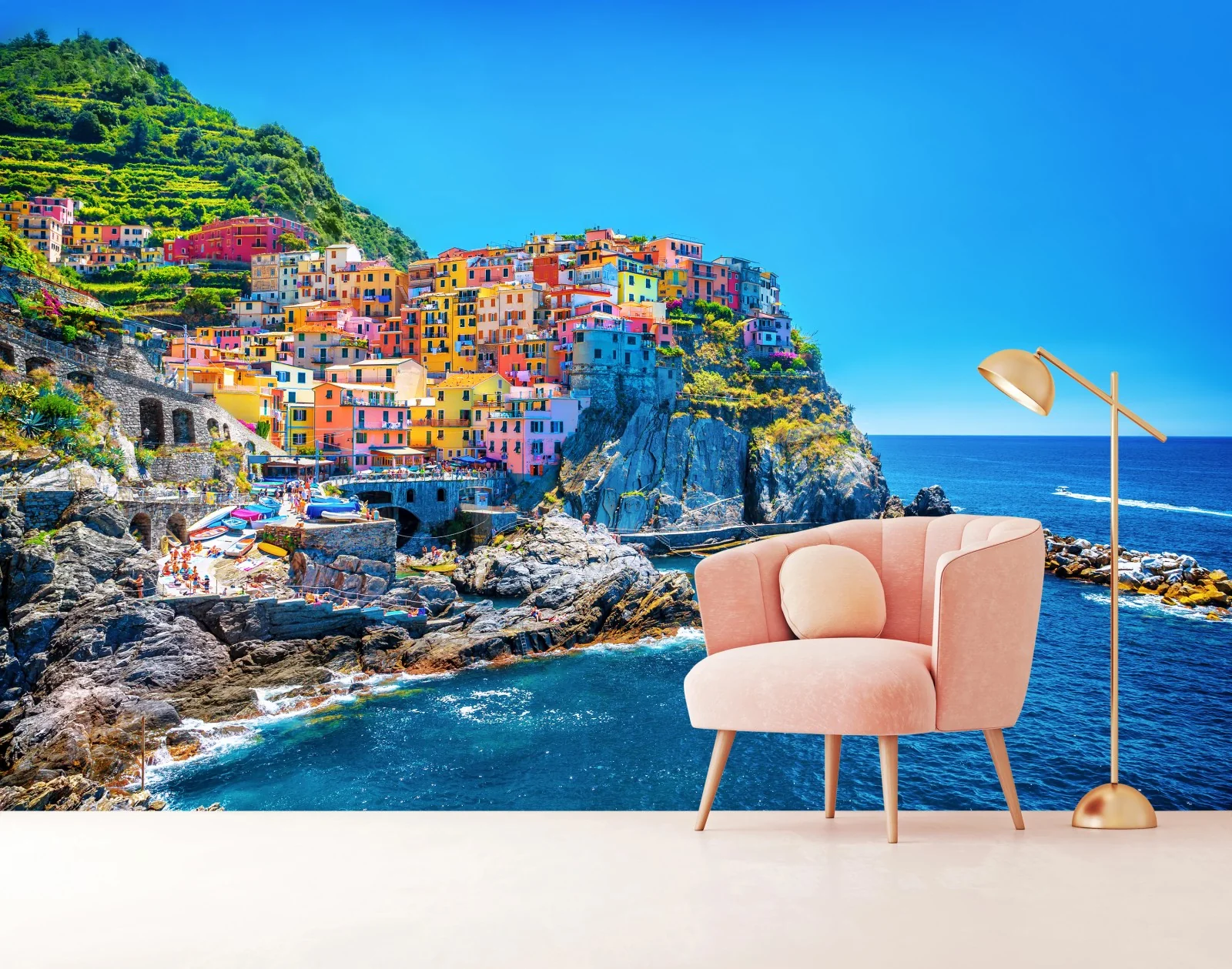 Fototapete Farbenfrohes dorf am klippenmeer