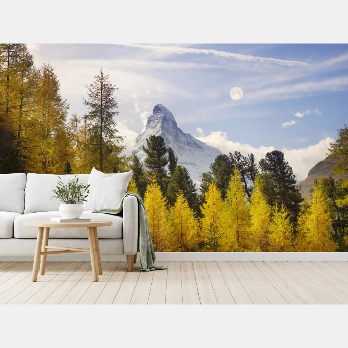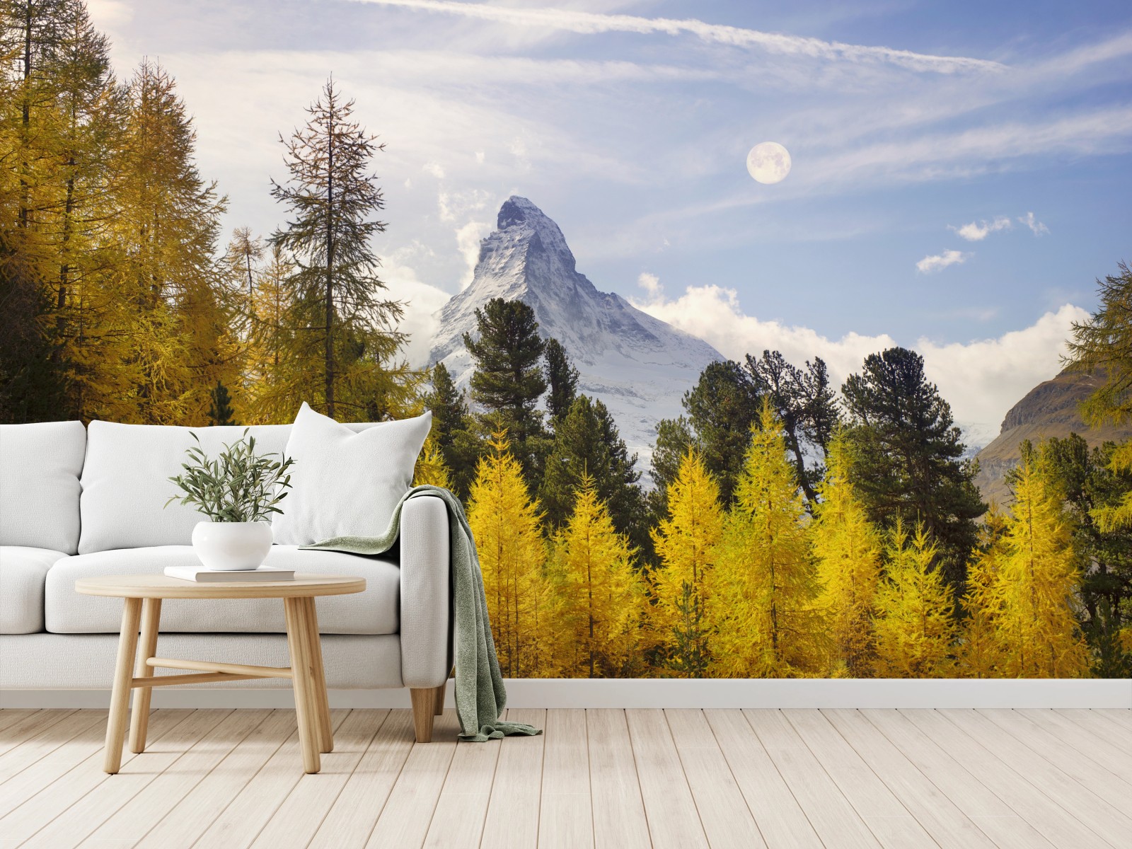 Atemberaubende herbstliche Szenerie mit goldenen Lärchen, die den schneebedeckten Gipfel des Matterhorns einrahmen und alpenhafte Ruhe in Ihren Raum bringen.MehrWeniger