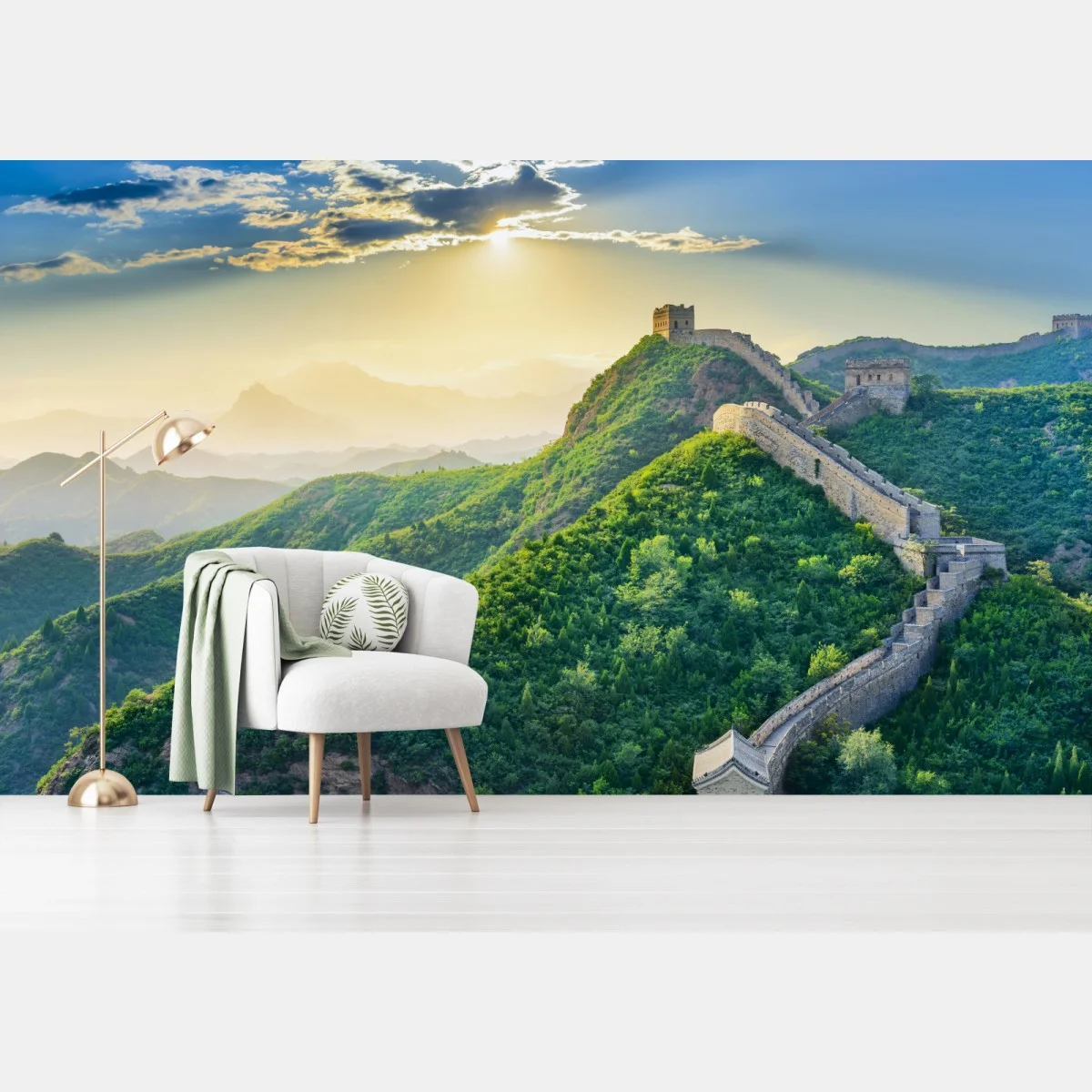 Fototapete Chinesische Mauer bei sonnenaufgang über grünen bergen