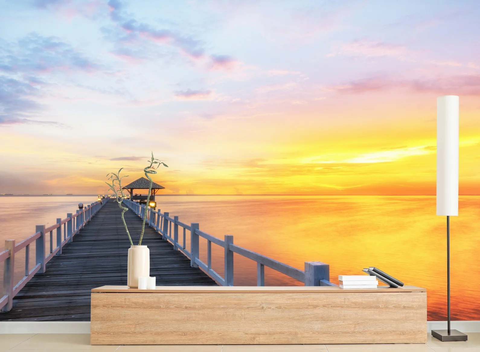 Fototapete Hölzerner steg im sonnenaufgang