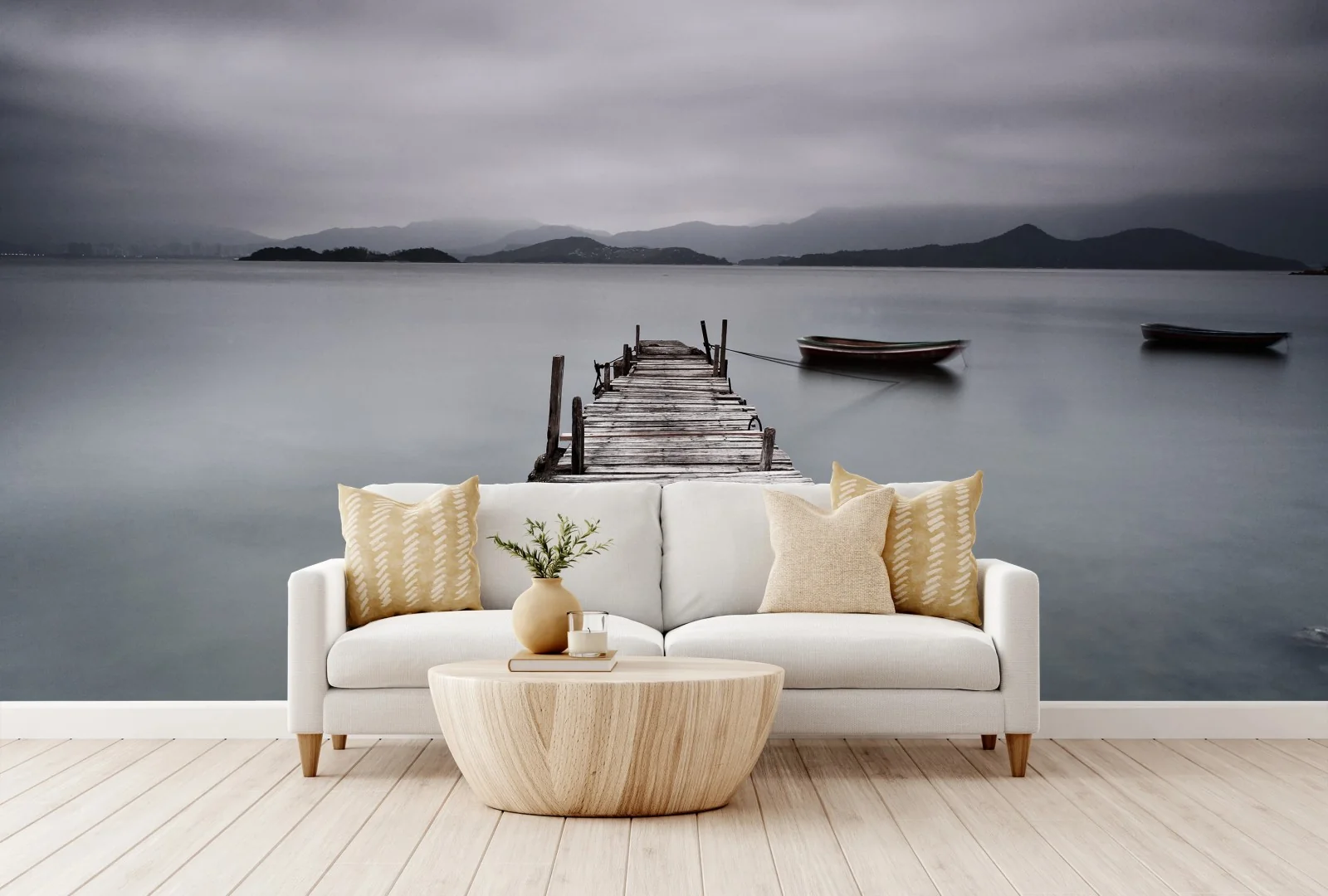 - minimalistisch, meer, landschaft, meerlandschaft, boot, hafen, seebrücke, anleger, ruig, monochromatisch