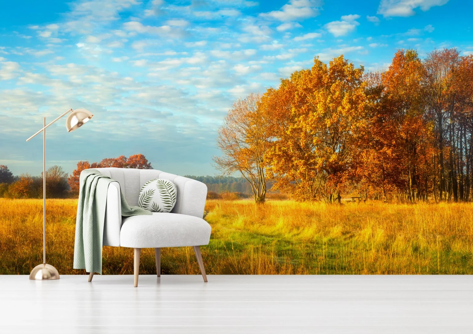 - herbst, landschaft, blauer himmel, bäume, wiese, ruhe, sonne, ländlich, orangene blätter, goldenes gras