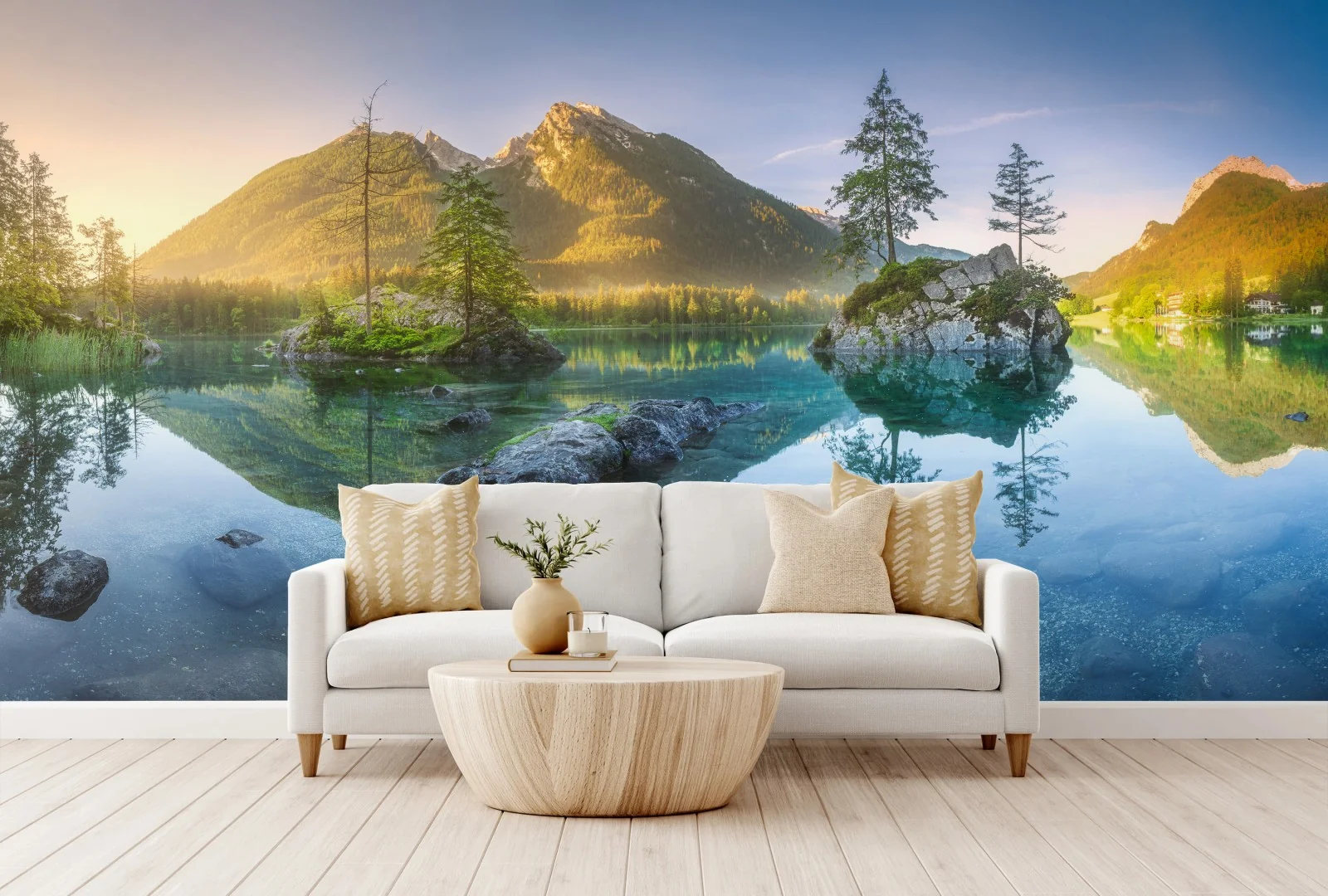 Fototapete Alpensee bei sonnenaufgang mit spiegelnder reflexion