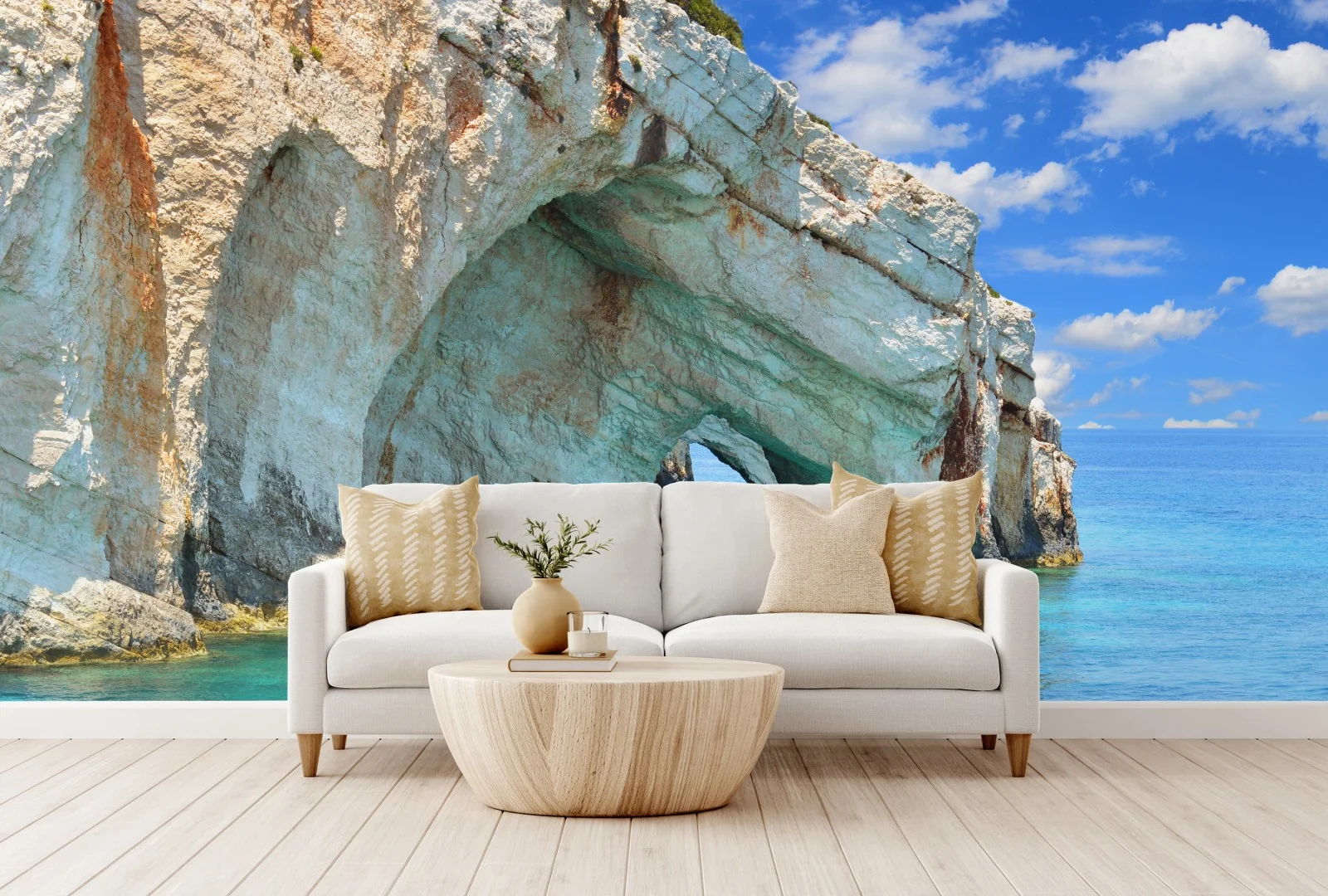 Atemberaubender Küstenblick auf die blauen Höhlen von Zakynthos mit türkisfarbenem Wasser und dramatischen Kalksteinbögen, perfekt um mediterrane Ruhe in Ihr Zuhause zu bringen.MehrWeniger
