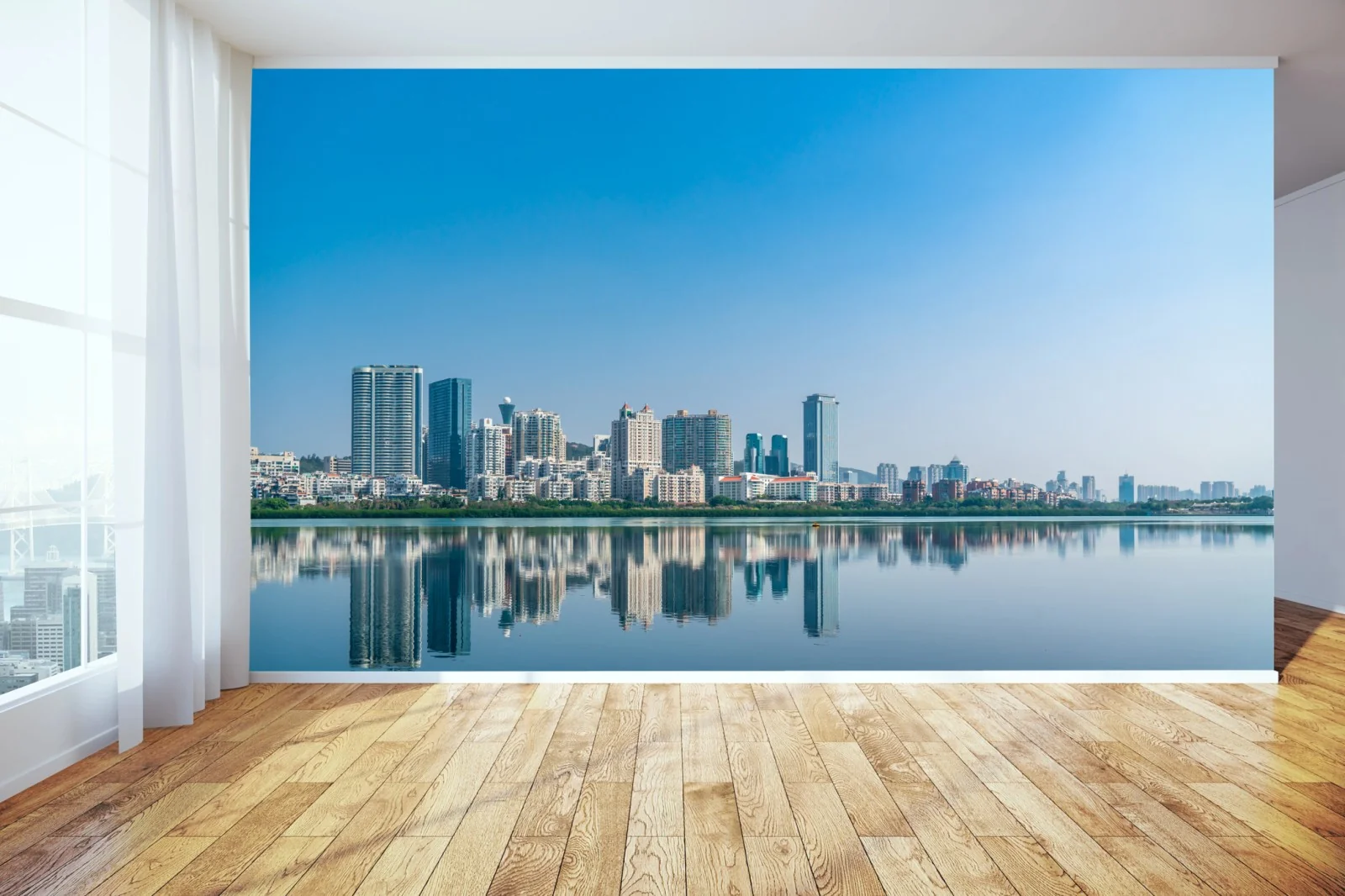 Fototapete Ruhige stadtsilhouette mit spiegelung im wasser