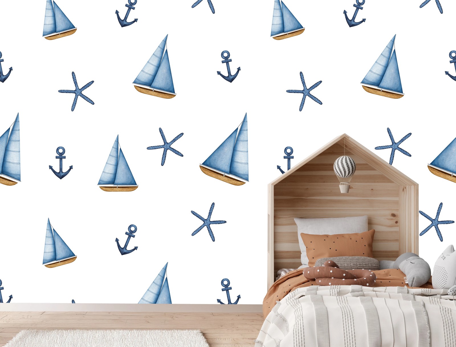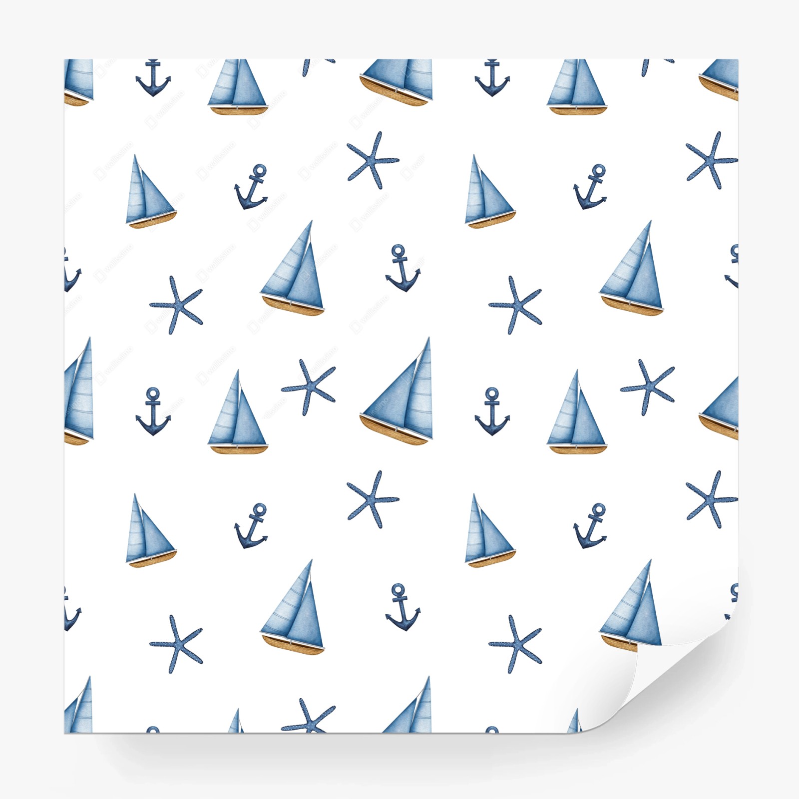 - kinderzimmer, meer, blau, boot, segelboot, anker, seestern, maritim, aquarell, nahtloses muster