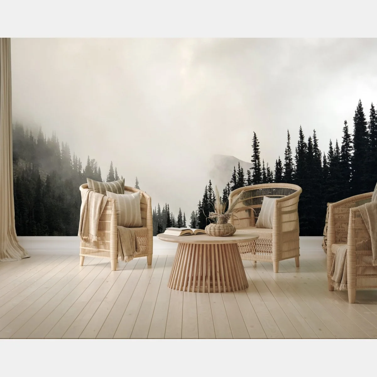 Bringen Sie Ruhe in Ihren Raum mit einem nebligen Nadelwald, der eine beruhigende Atmosphäre schafft.MehrWeniger