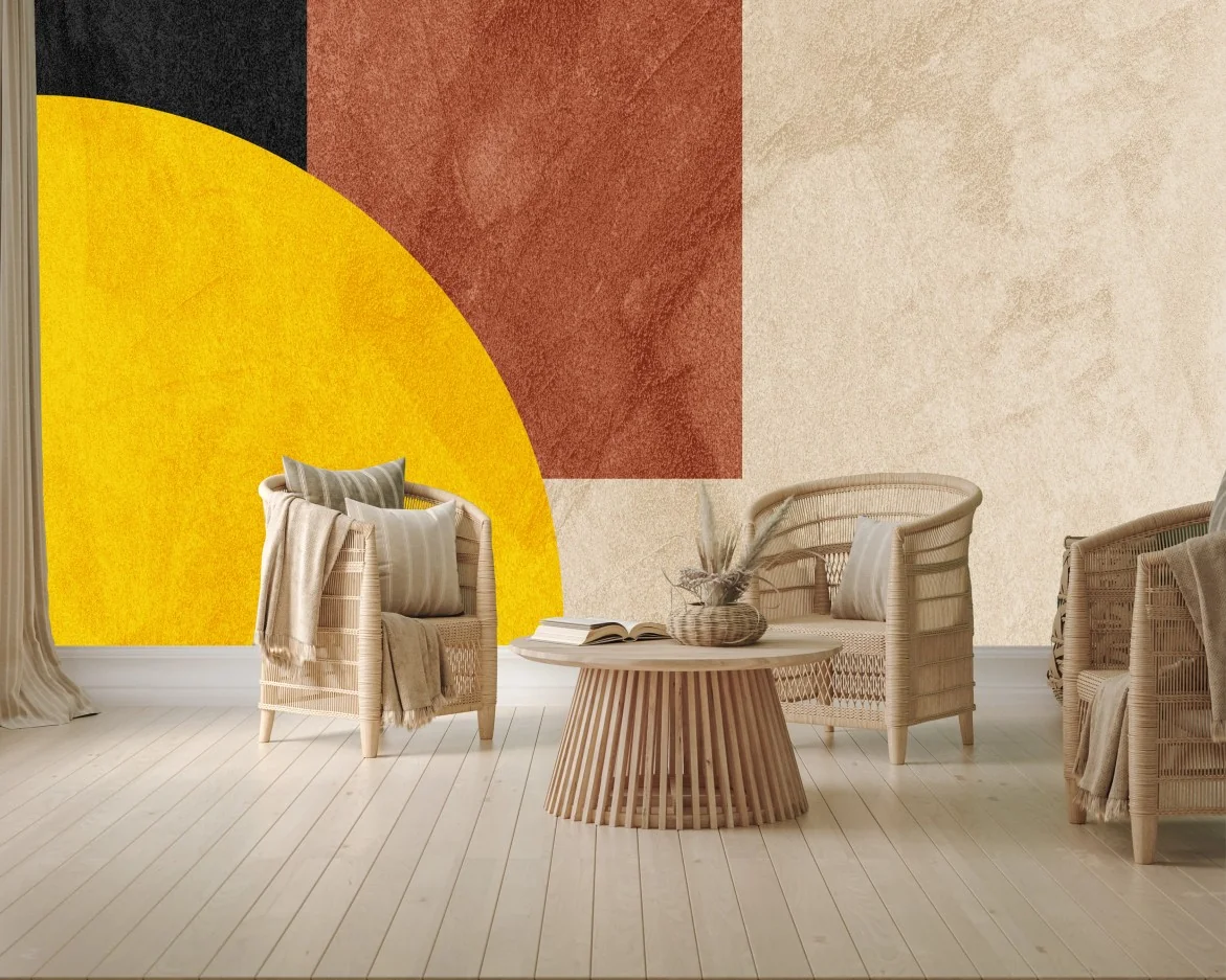 - minimalistisch, modern, textur, abstrakt, geometrisch, wandkunst, formen, bogen, gelber kreis, kontrast