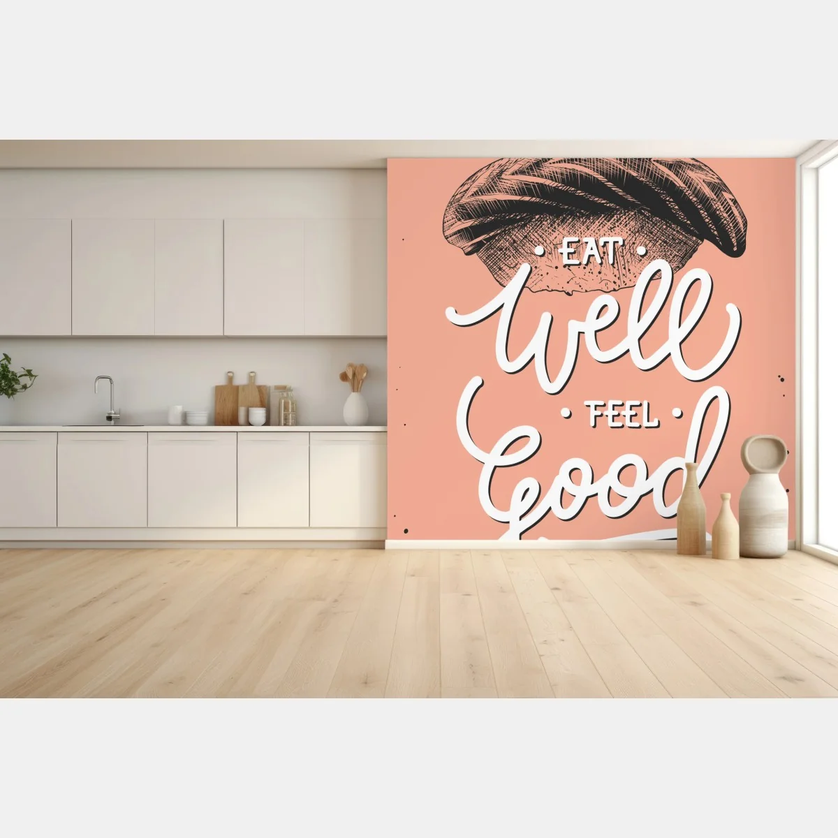 Bringen Sie einen modernen, japanisch inspirierten Akzent in Ihre Küche mit handgezeichneter Lachs-Sushi-Illustration und kalligrafischem Schriftzug auf pastellfarbenem Hintergrund.MehrWeniger
