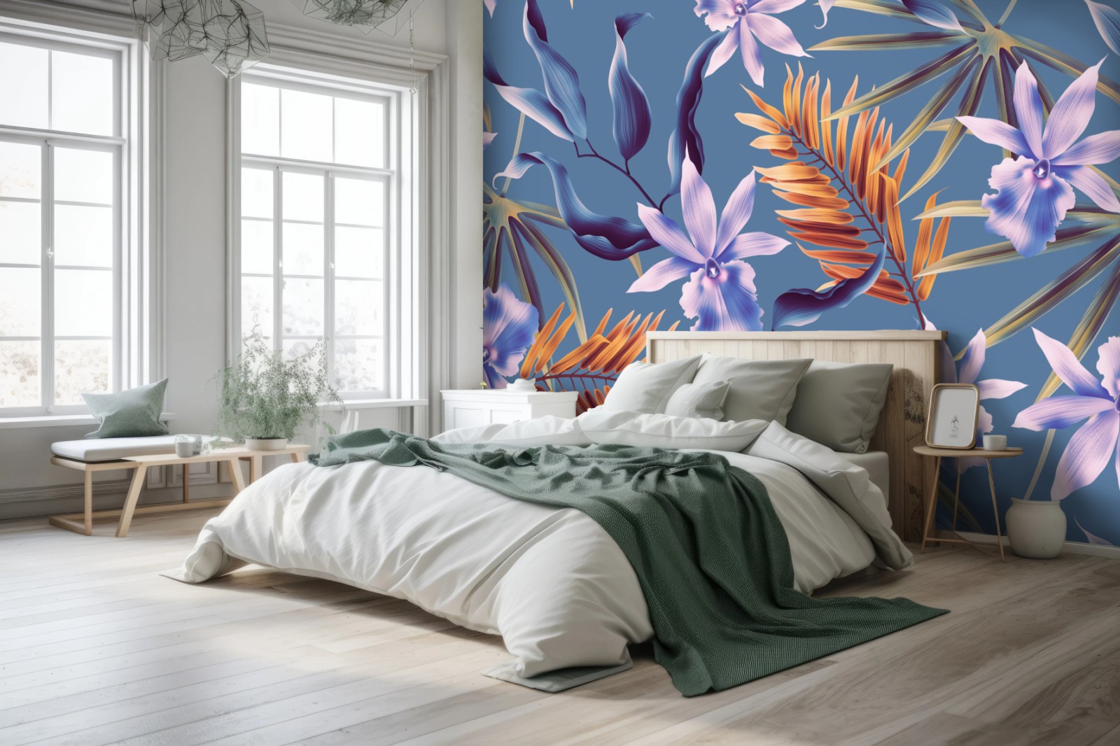 - blumen, tropisch, nahtloses muster, exotische blumen, dekoration, blauer hintergrund, botanisches muster, palmblätter, orchidee, blattmotiv