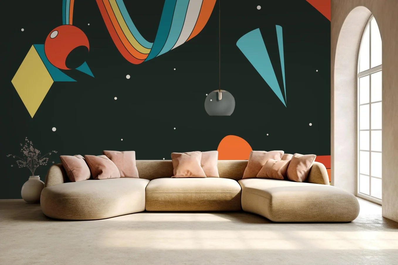 - illustration, minimalistisch, modern, abstrakt, geometrisch, farbenfroh, retro, regenbogen, weltraum, wohnzimmer