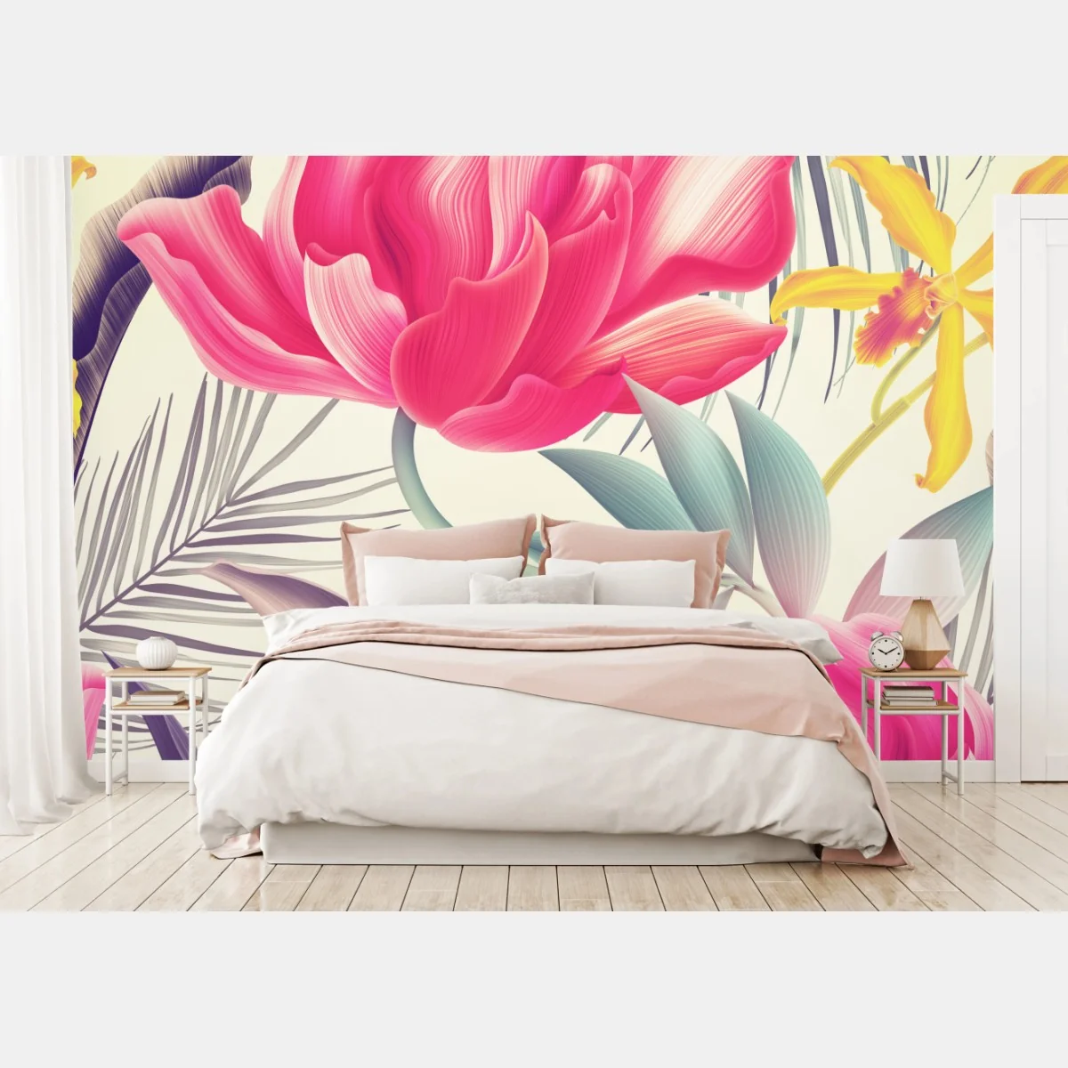 - botanisch, tropisch, pastell, blätter, blumenmuster, wandkunst, tropische blätter, pfingstrose, rosa blumen, orchideen