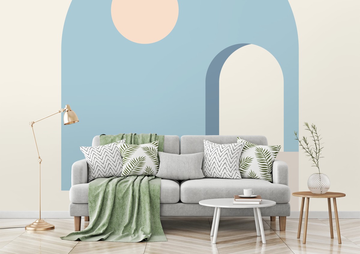 - minimalistisch, modern, vektor, abstrakt, pastell, geometrisch, wandkunst, bogen, treppe, innenraum