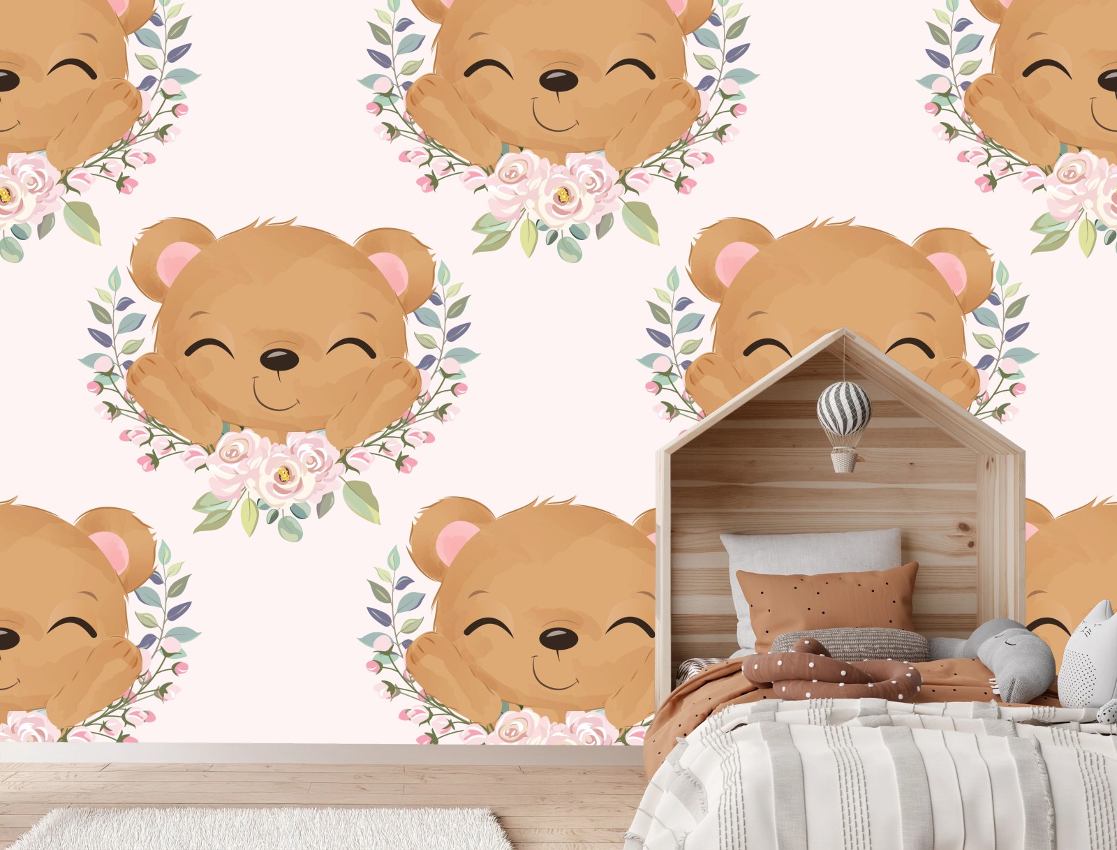 Fototapete Lächelnder teddybär im blumenmuster