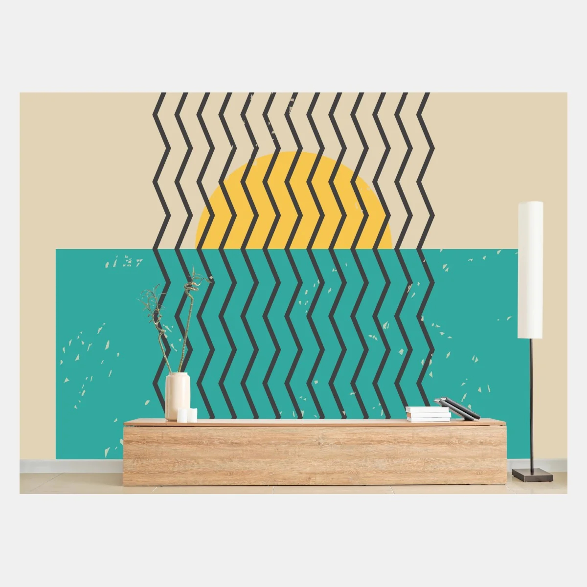 - türkis, minimalistisch, modern, meer, abstrakt, wellen, sonnenaufgang, geometrisch, gelb, retro