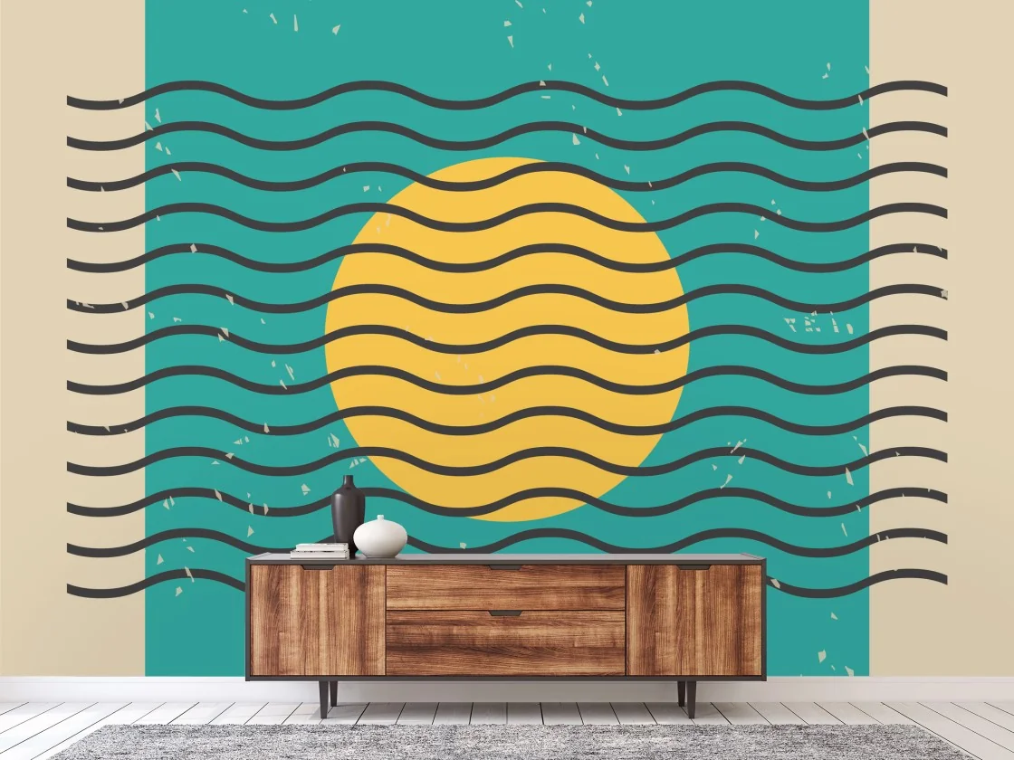 - türkis, minimalistisch, meer, poster, abstrakt, wellen, geometrisch, gelb, retro, sonne