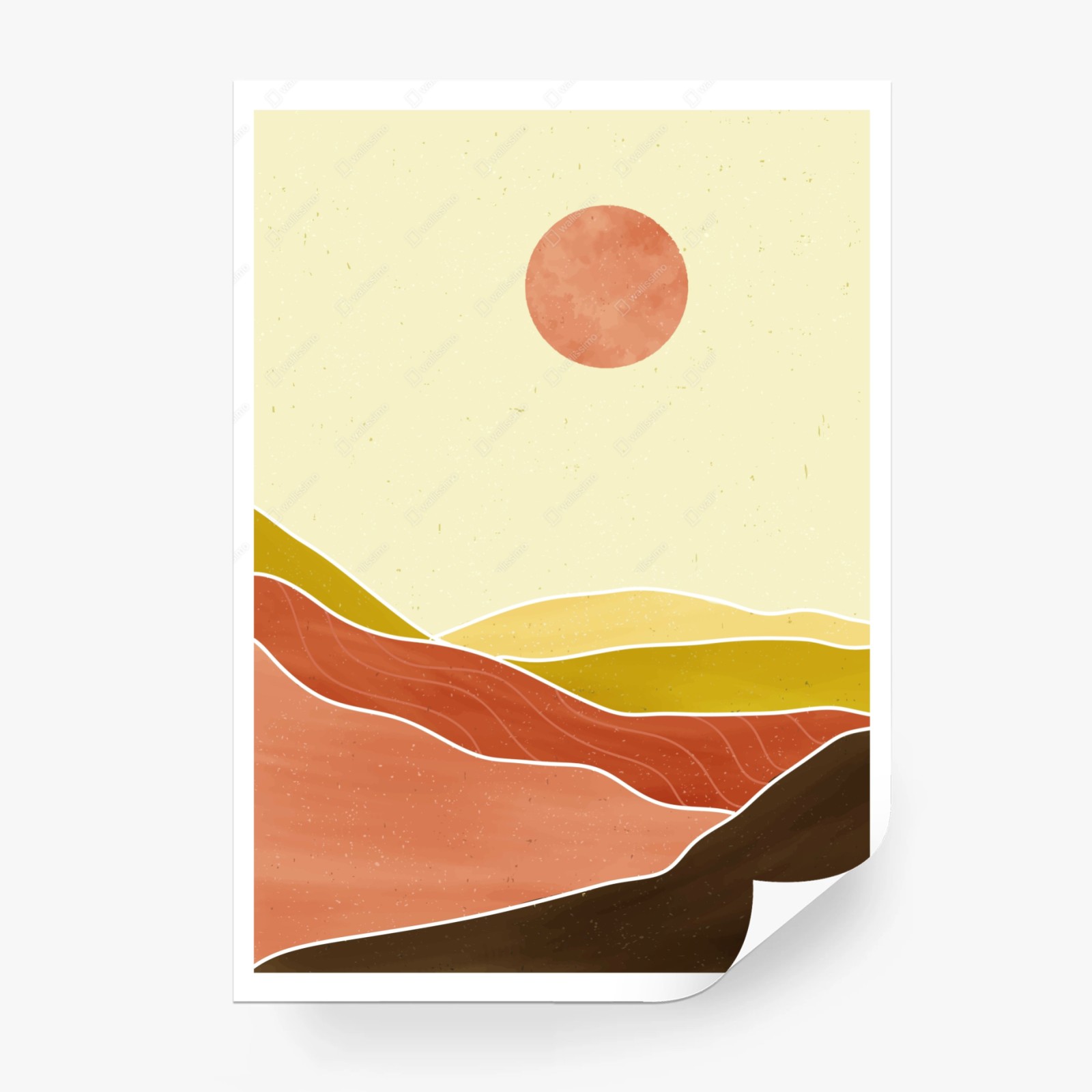 - minimalistisch, modern, poster, landschaft, berge, abstrakt, retro, terrakotta, sonne, senfgelb