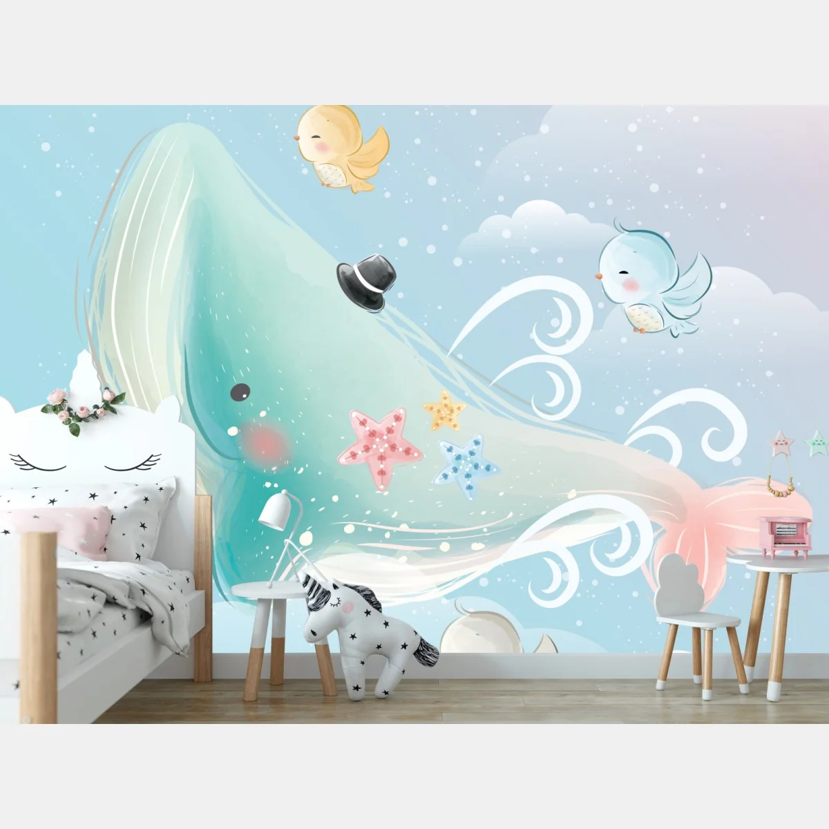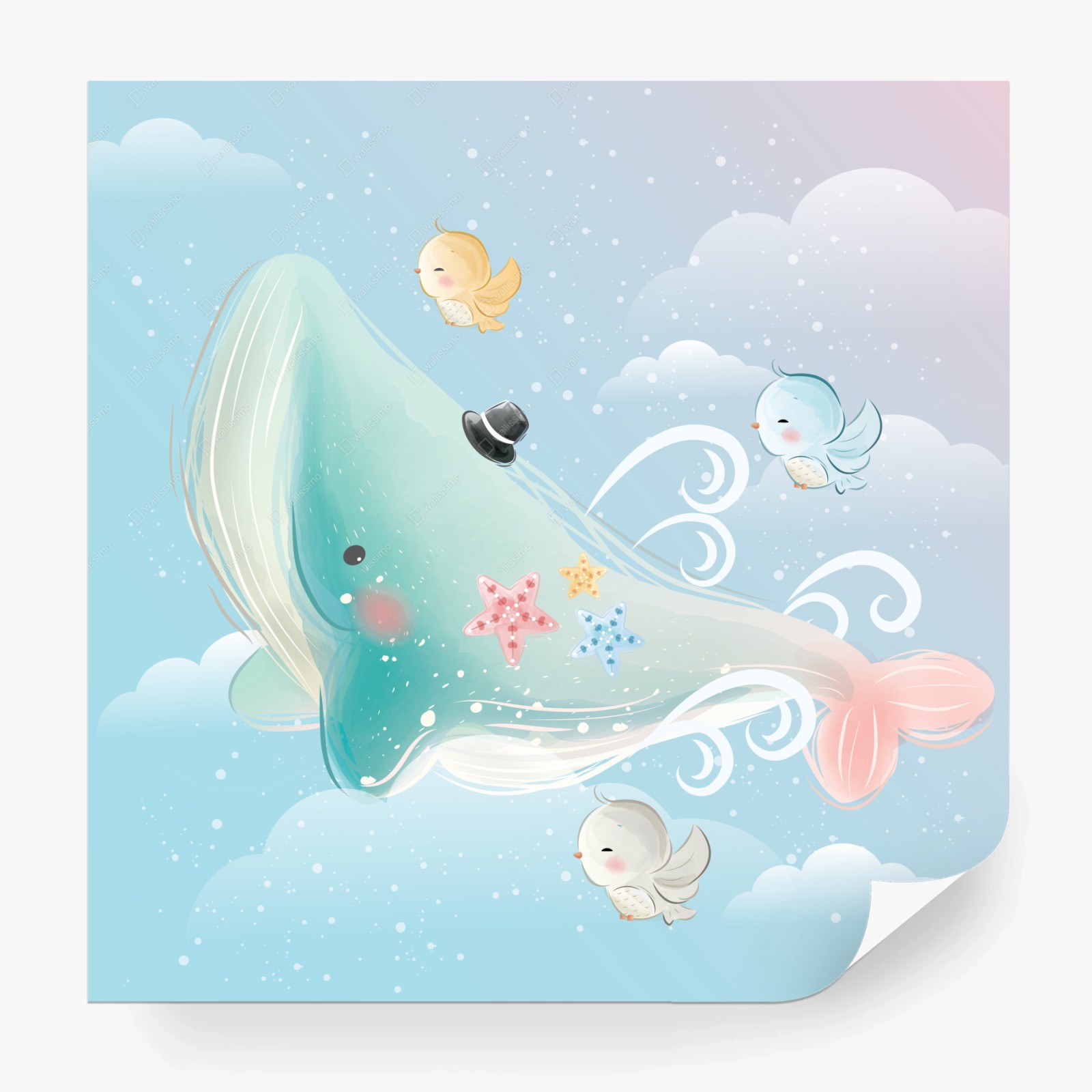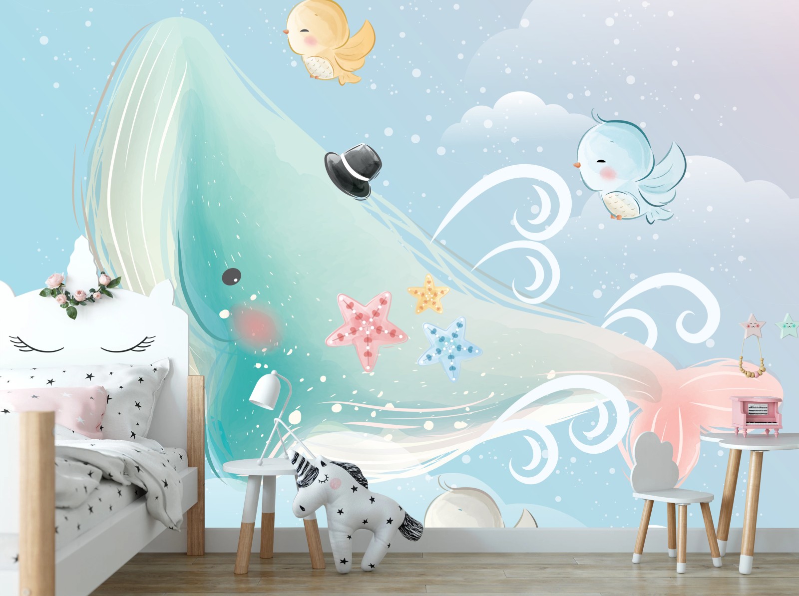 - kinderzimmer, ozean, seestern, pastell, vögel, himmei, niedlich, verträumt, wal, kinderillustration