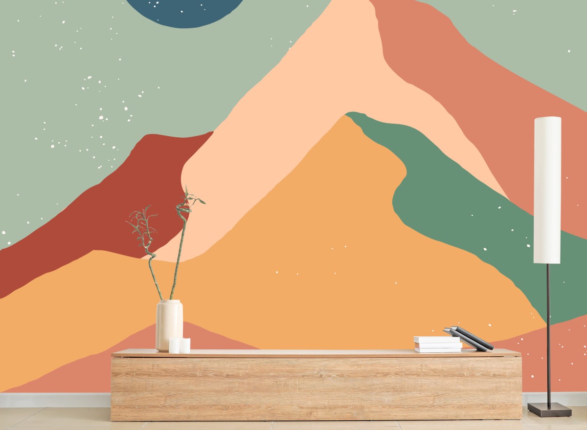 - minimalistisch, landschaft, berg, abstrakt, pastell, wandbild, retro, erdtöne, mond, mid century