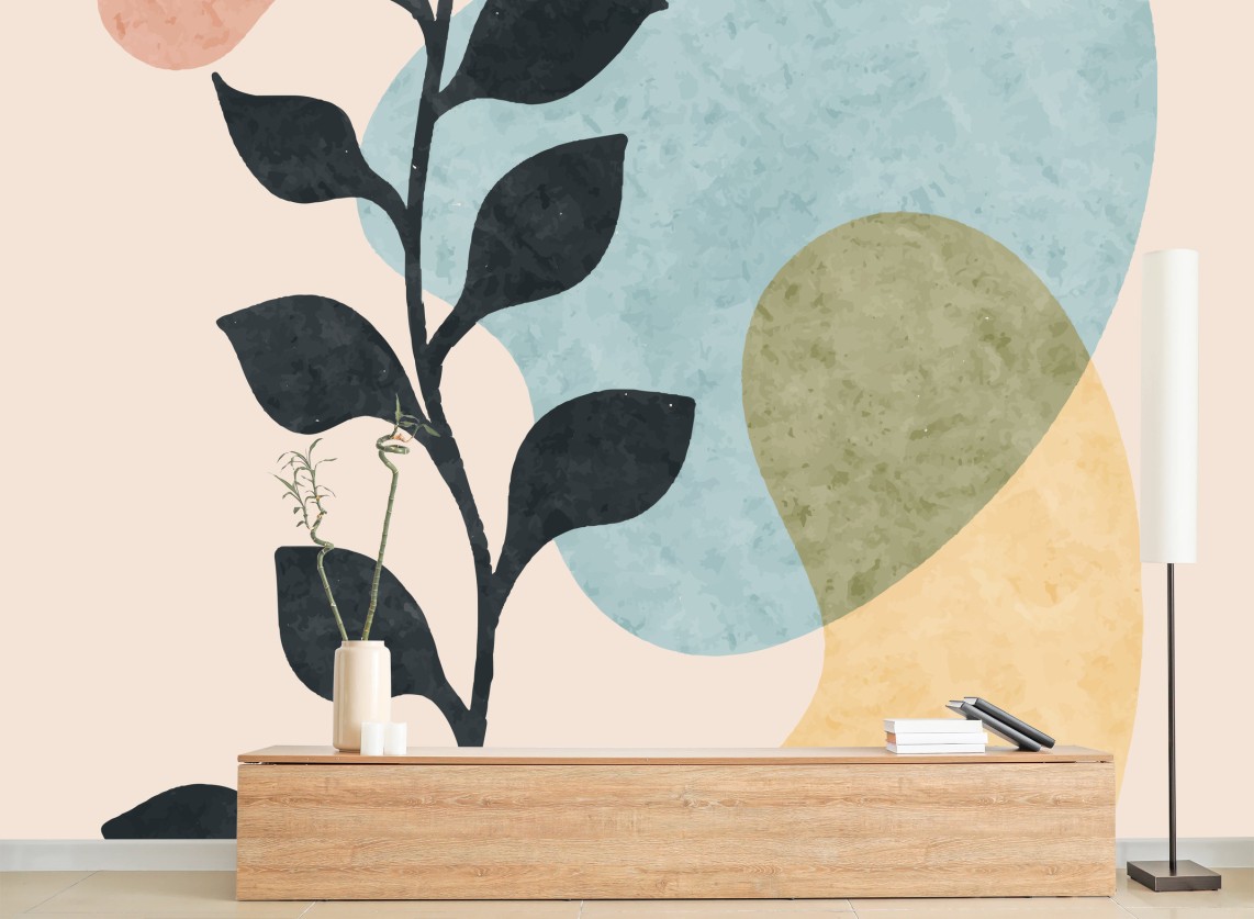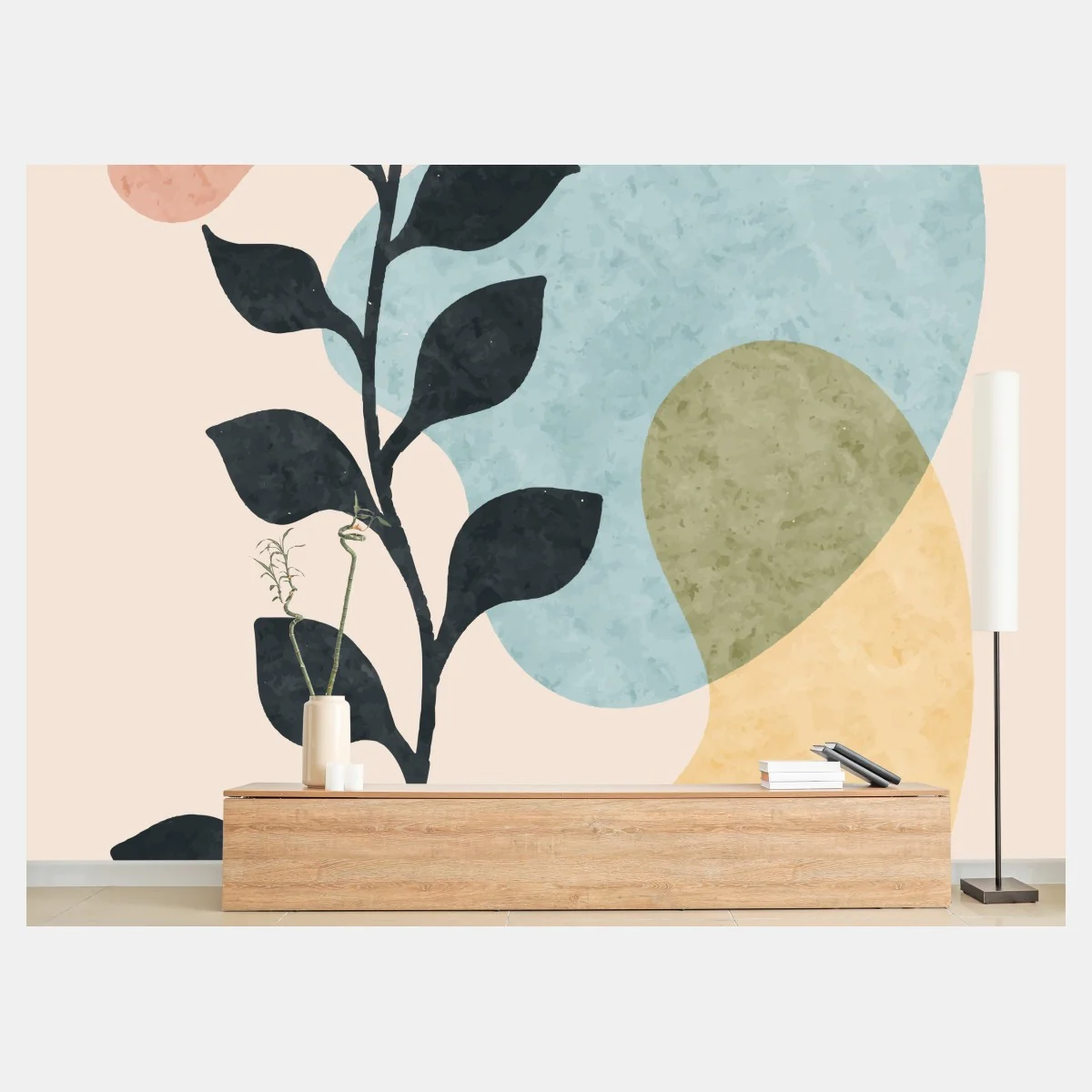 - minimalistisch, modern, pastell, blätter, boho, wandkunst, organische formen, abstrakte botanik, pflanzensilhouette, neutrales interieur