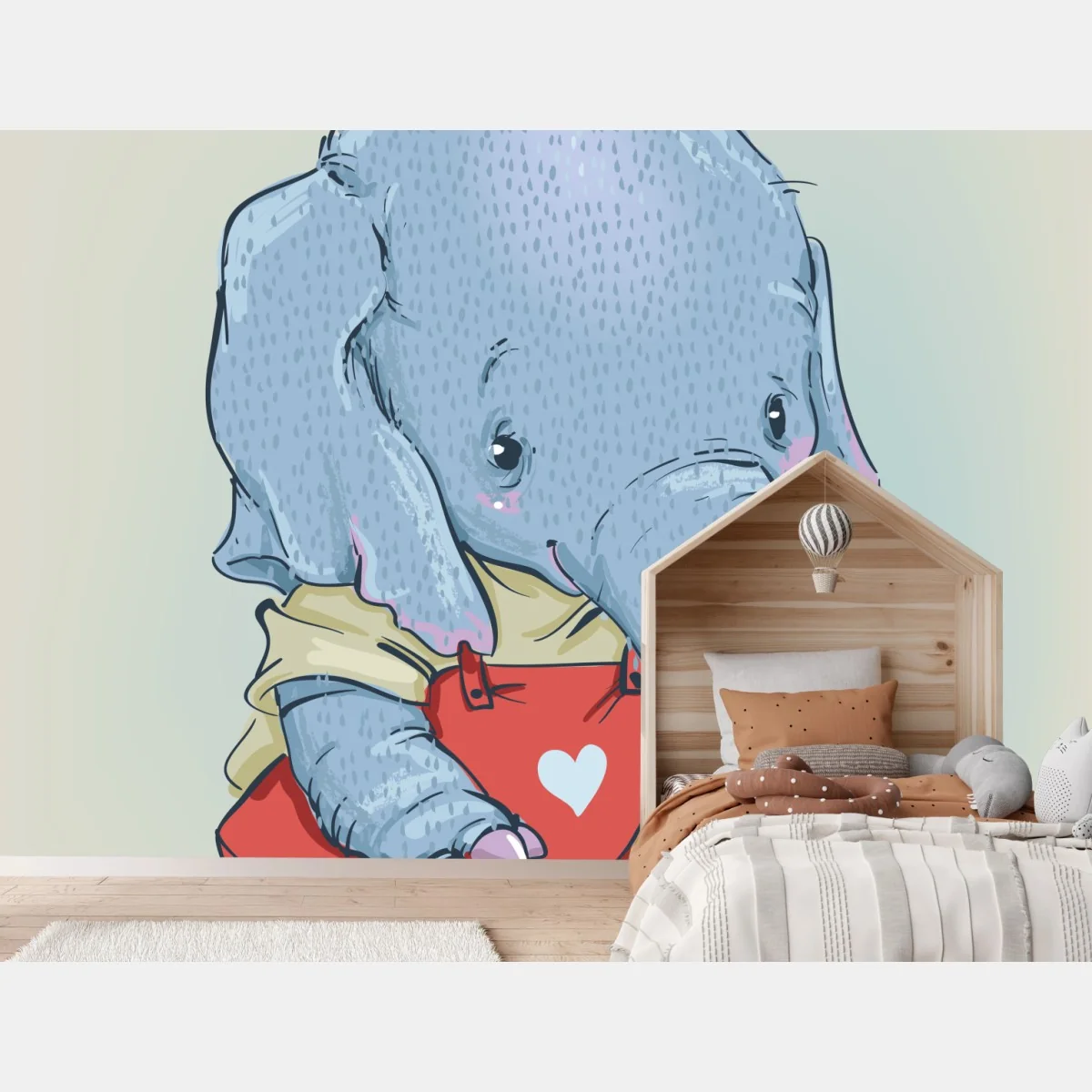 - illustration, kinderzimmer, kinder, cartoon, wandbild, tier, niedlich, herz, baby elefant, rote latzhosen