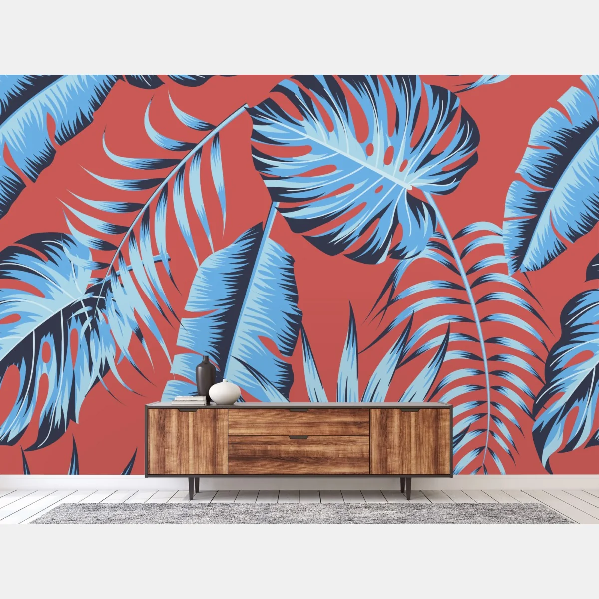 Fototapete Blaue tropische blätter auf korallenfarbenem hintergrund