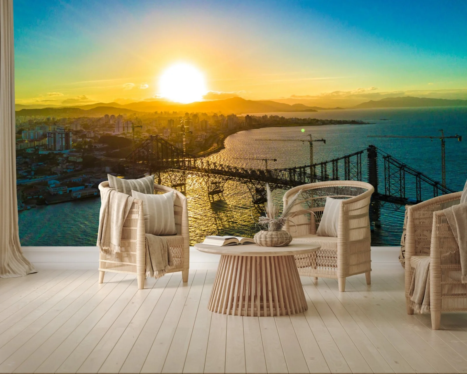 - meer, stadtbild, sonnenuntergang, skyline, küste, ufer, architektur, brücke, goldene stunde, silhouette
