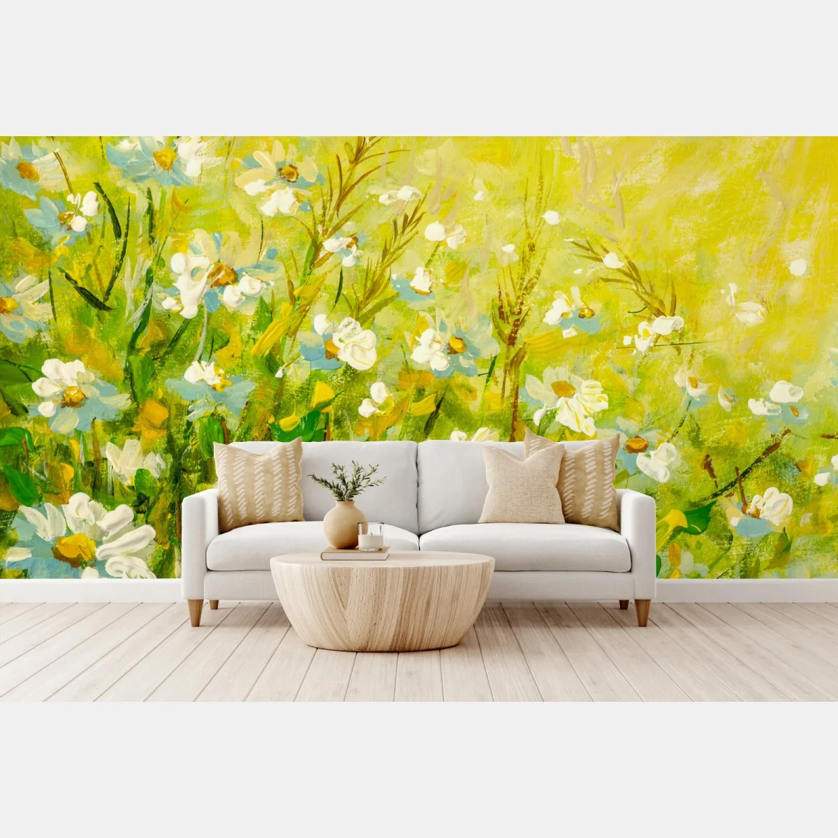 - botanisch, blumen, wiese, grün, wohnkultur, gelb, gänseblümchen, frühling, ölmalerei, kamille