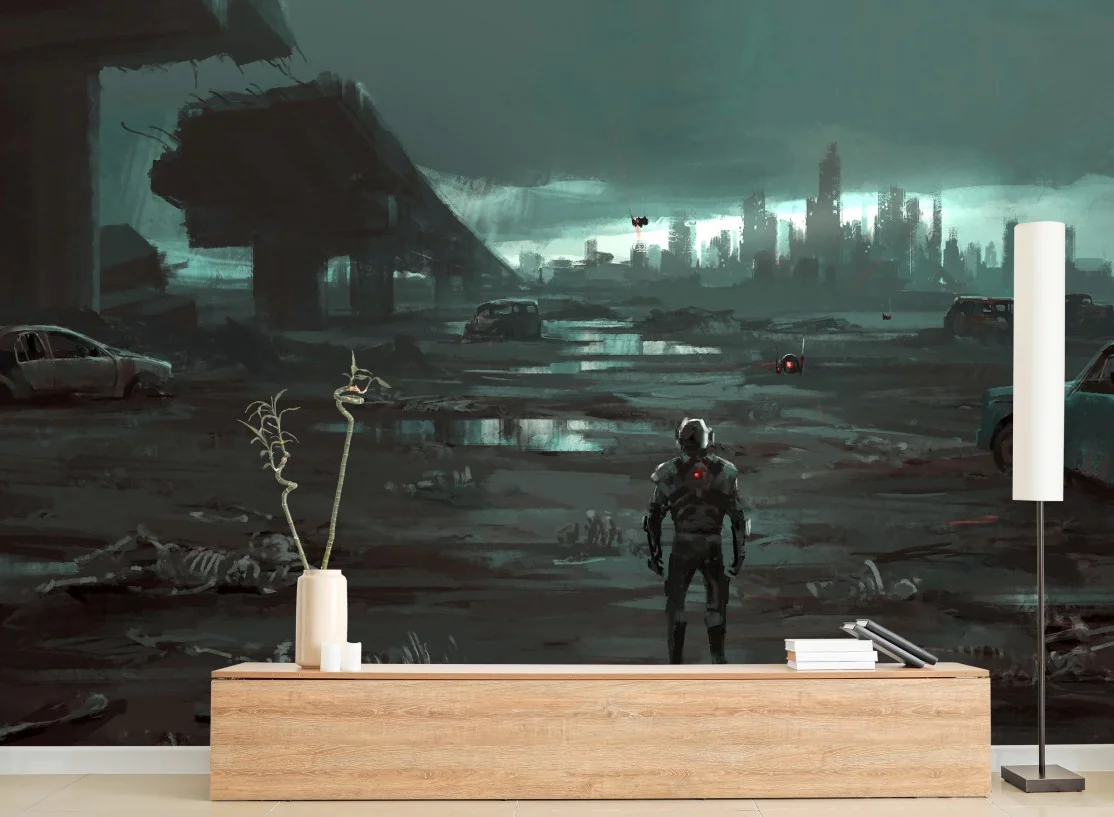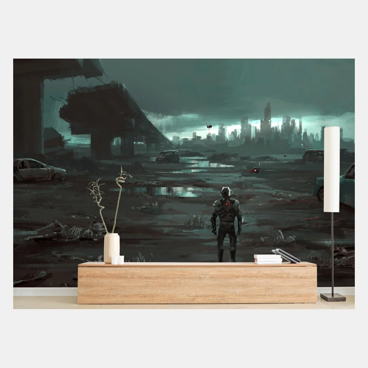 Bringen Sie mit dieser atmosphärischen digitalen Illustration ein düsteres postapokalyptisches Motiv an Ihre Wand, das eine verlassene Stadt und einen einsamen Überlebenden zeigt.MehrWeniger