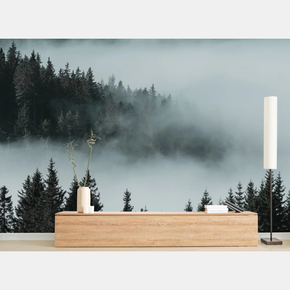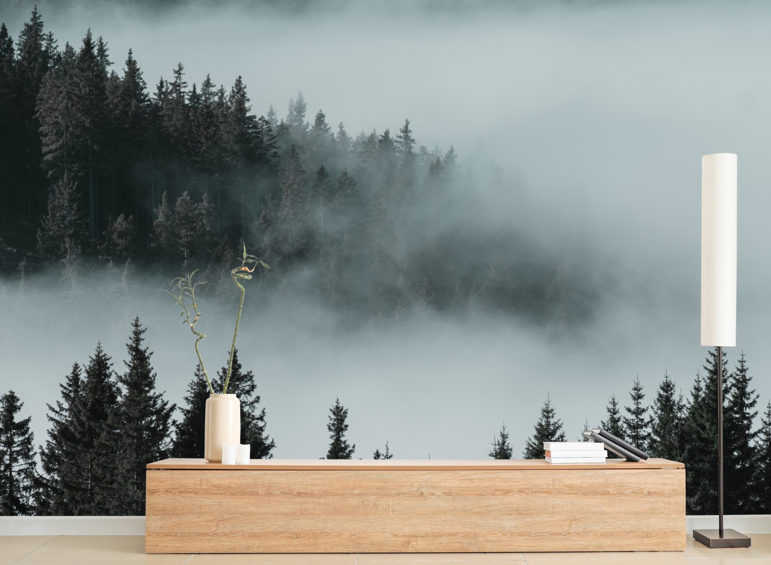 Bringen Sie Ruhe und Tiefe in Ihr Zuhause mit diesem Bild eines nebligen Kiefernwaldes.MehrWeniger