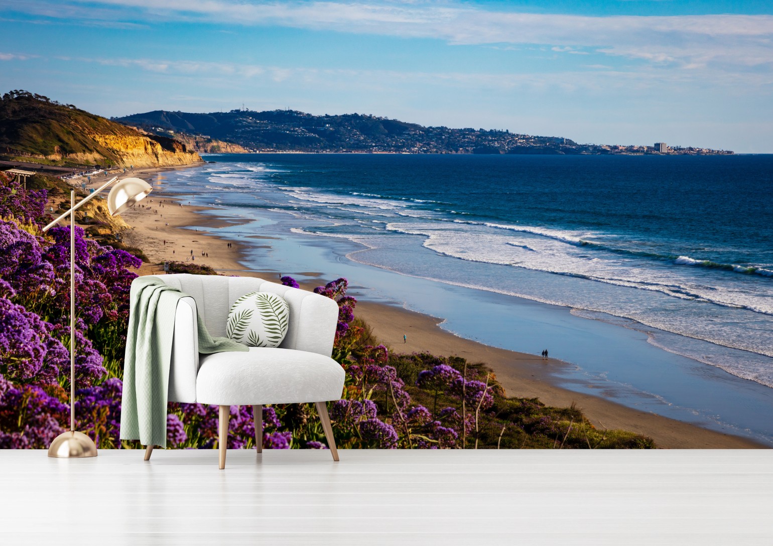 - meer, küste, strand, ufer, landschaft, wellen, klippen, sand, wilde blumen, lila blumen