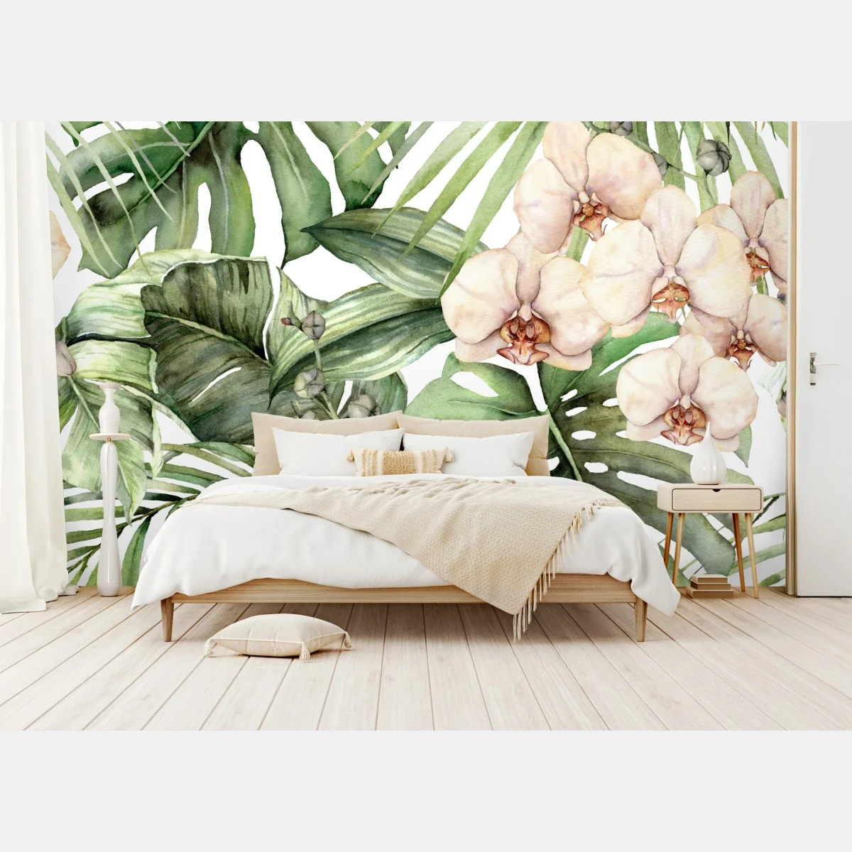 Fototapete Zarte aquarell orchideen und tropische blätter