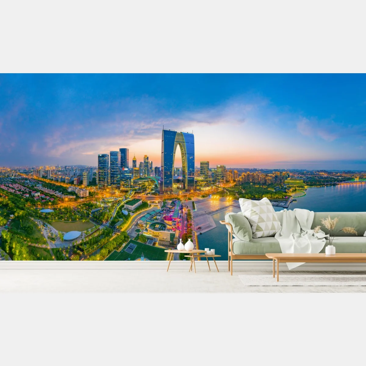 Fototapete Panoramablick auf die stadt bei dämmerung