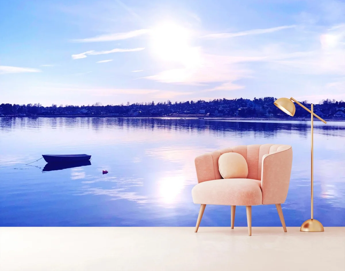 Bringen Sie ruhige Gelassenheit in Ihr Zuhause mit diesem minimalistischen Motiv eines blauen Sees, einem einsamen Boot und sanften Sonnenreflexionen.MehrWeniger