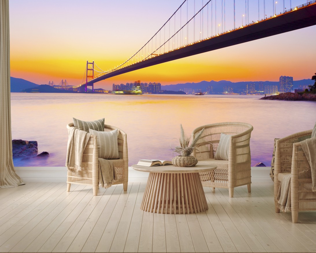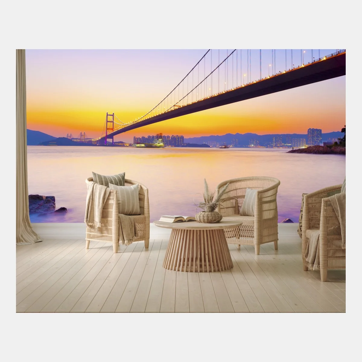 Fototapete Goldener sonnenuntergang über hängebrücke