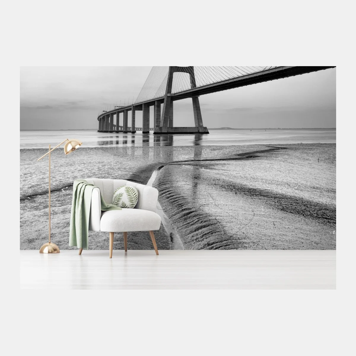Bringen Sie Ruhe und architektonische Eleganz in Ihr Zuhause mit diesem schwarzweißen Foto einer Seilbrücke über stille Küsten.MehrWeniger