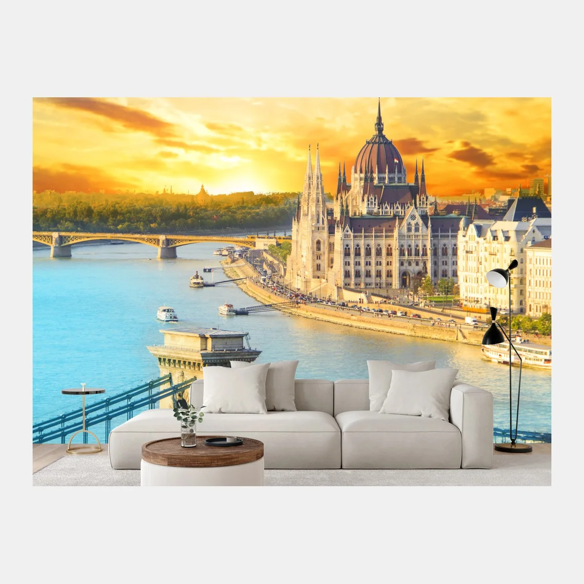Erleben Sie den goldenen Abend über Budapest mit dieser lebendigen Stadtansicht, die die Kettenbrücke und die Uferarchitektur zeigt.MehrWeniger