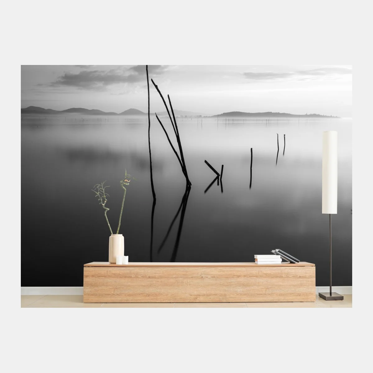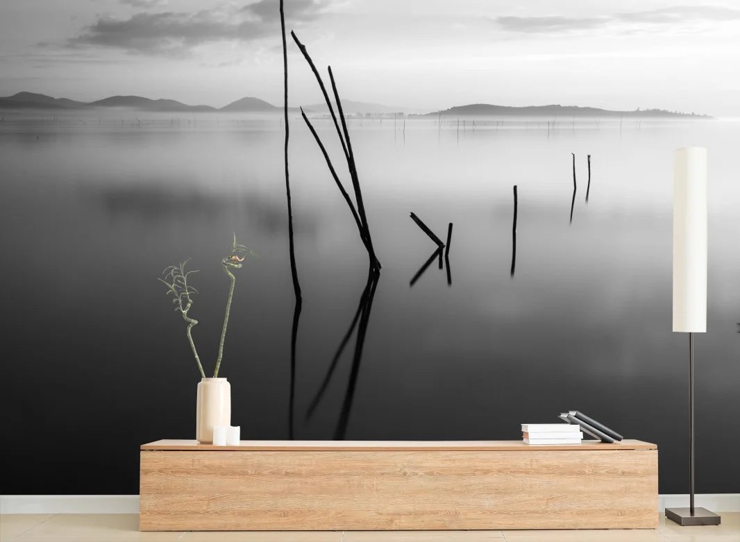 Fototapete Ruhiger monochromer see mit reflexionen