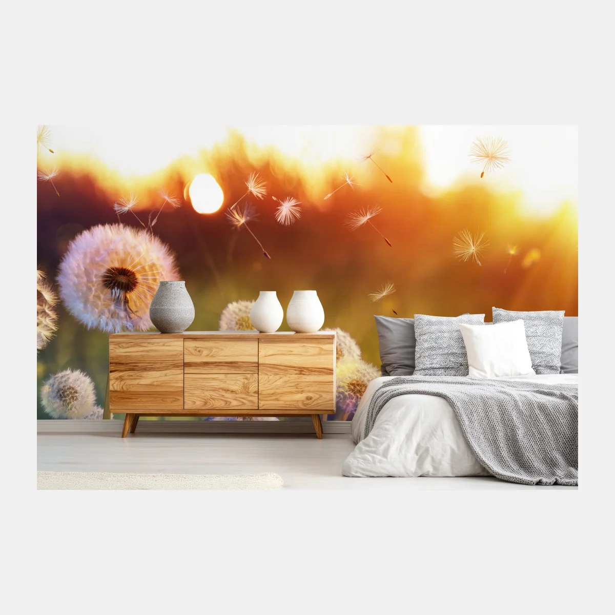 Fototapete Goldene löwenzahnwiese bei sonnenuntergang