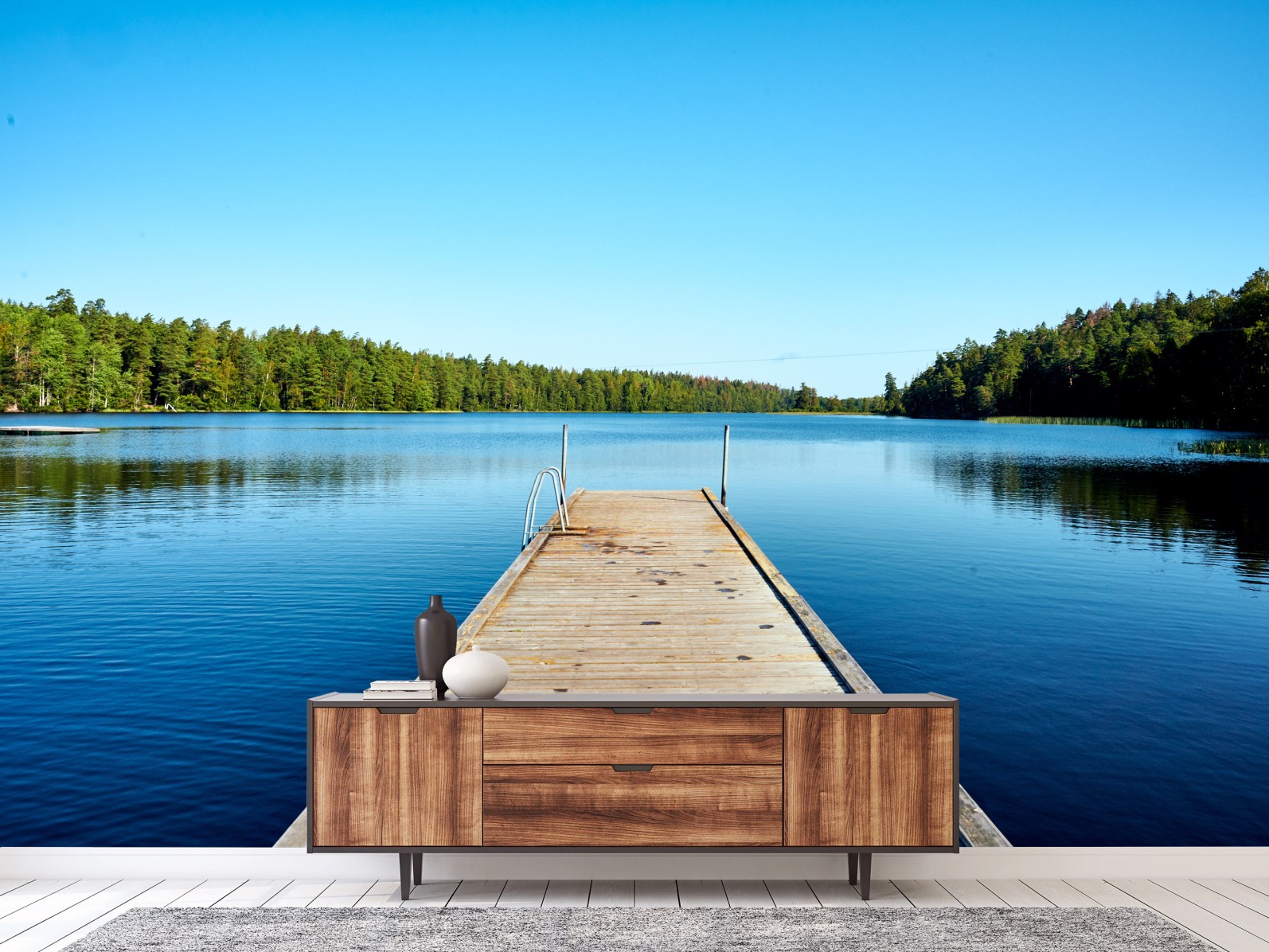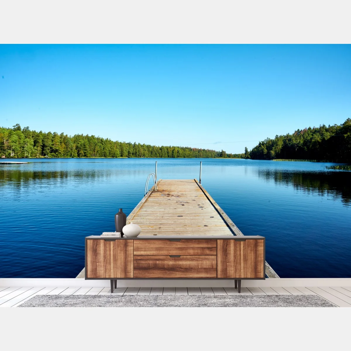 Fototapete Ruhiger steg am see mit waldspiegelung