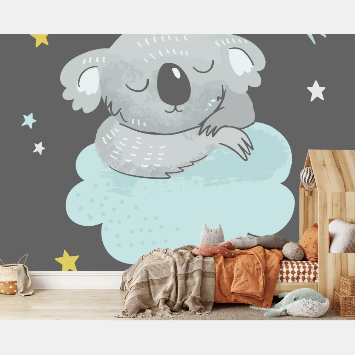 - kinderzimmer, sterne, wanddekoration, märchenhaft, koala, pastellillustration, wolke, traum, schlafender koala, niedliches tier